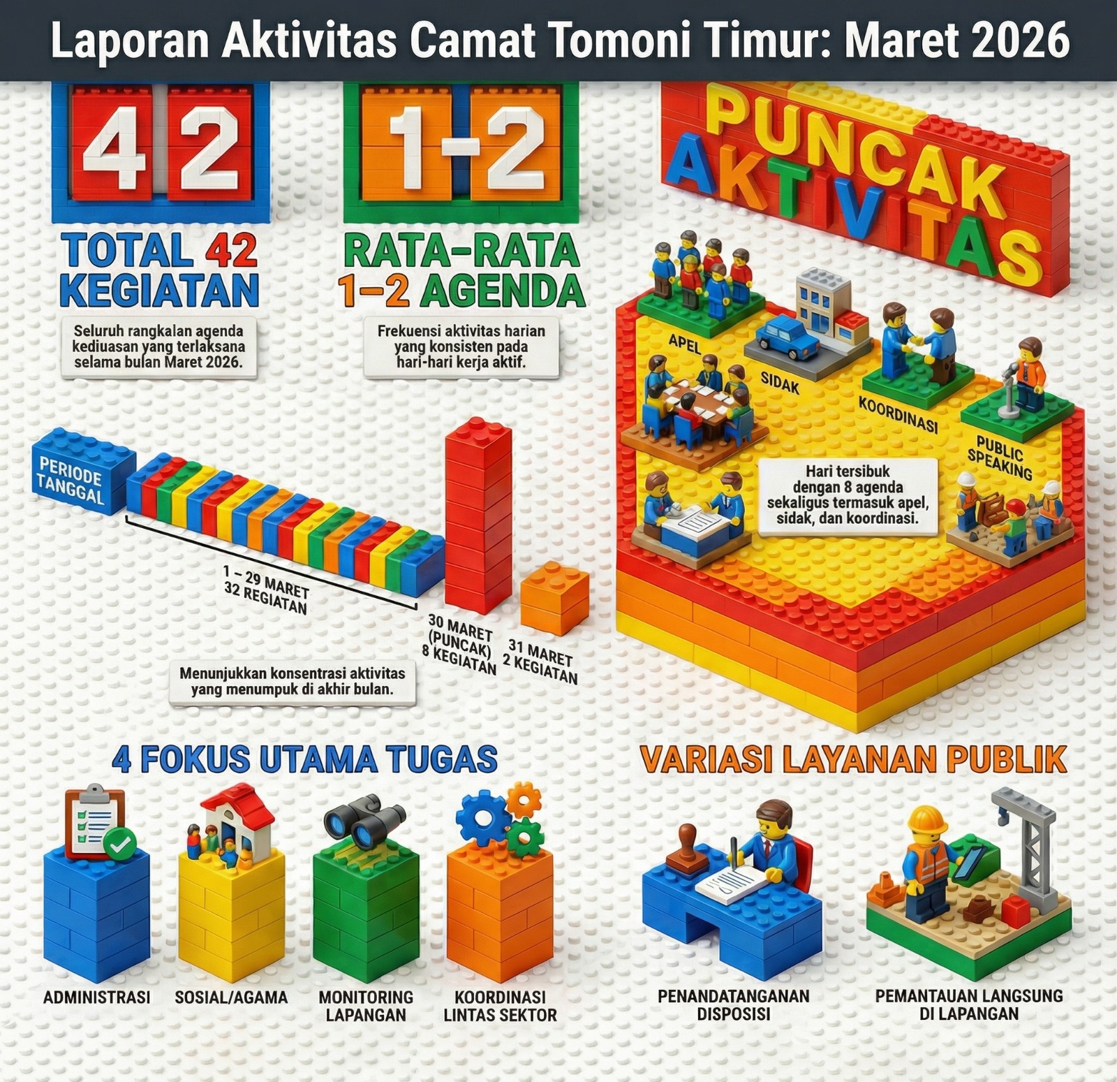 Luwu Timur, Chaneltimur.com – Camat Tomoni Timur , Yulius melaksanakan sebanyak 42 agenda kegiatan sepanjang bulan Maret 2026. Beragam kegiatan tersebut meliputi tugas pemerintahan, pelayanan publik, koordinasi lintas sektor, serta partisipasi aktif dalam kegiatan sosial dan keagamaan di wilayah Kecamatan Tomoni Timur.