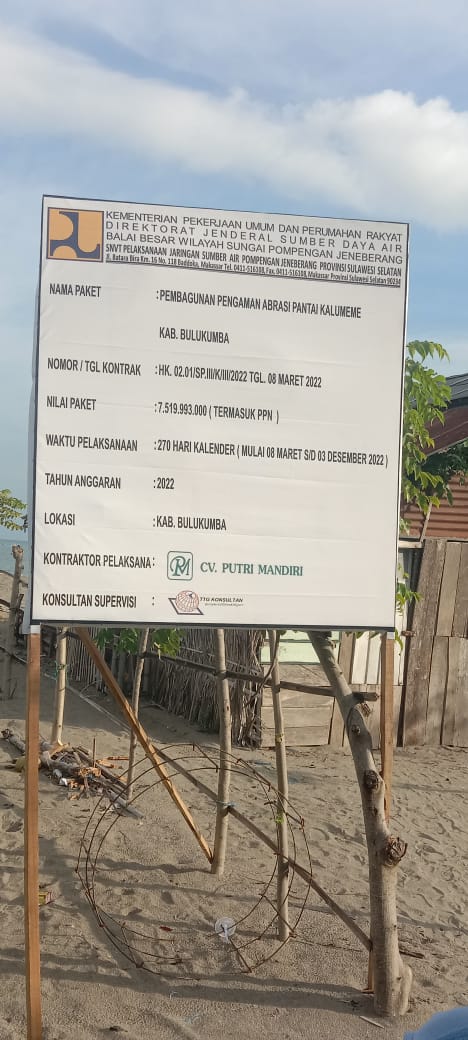 Bulukumba, Chaneltimur.com – Proyek pembangunan pengaman abrasi pantai yang sedang dalam proses pengerjaan di Kelurahan Kalumeme Kecamatan Ujung Bulu, Kabupaten Bulukumba, Sulawesi Selatan (Sulsel), disorot warga