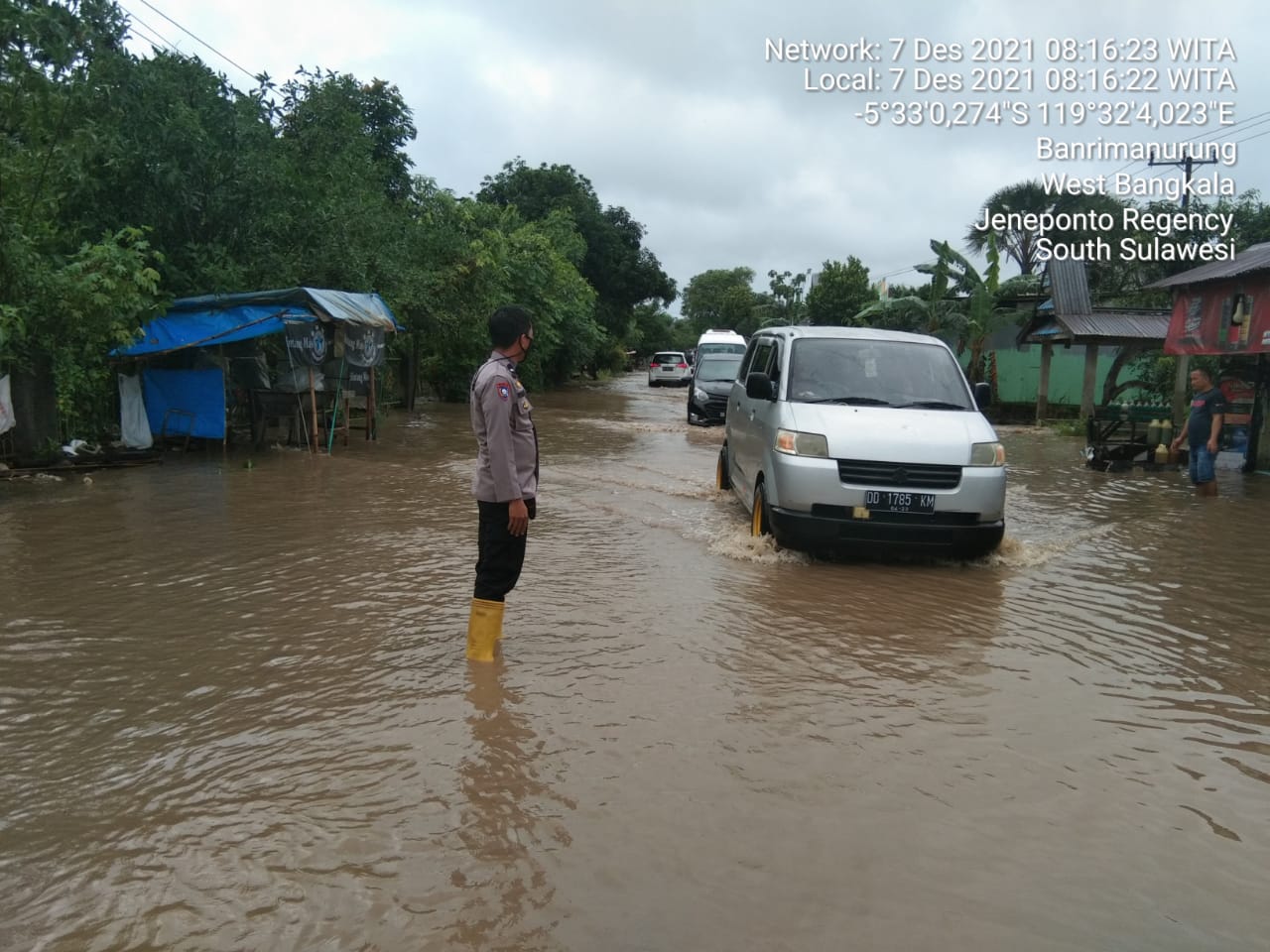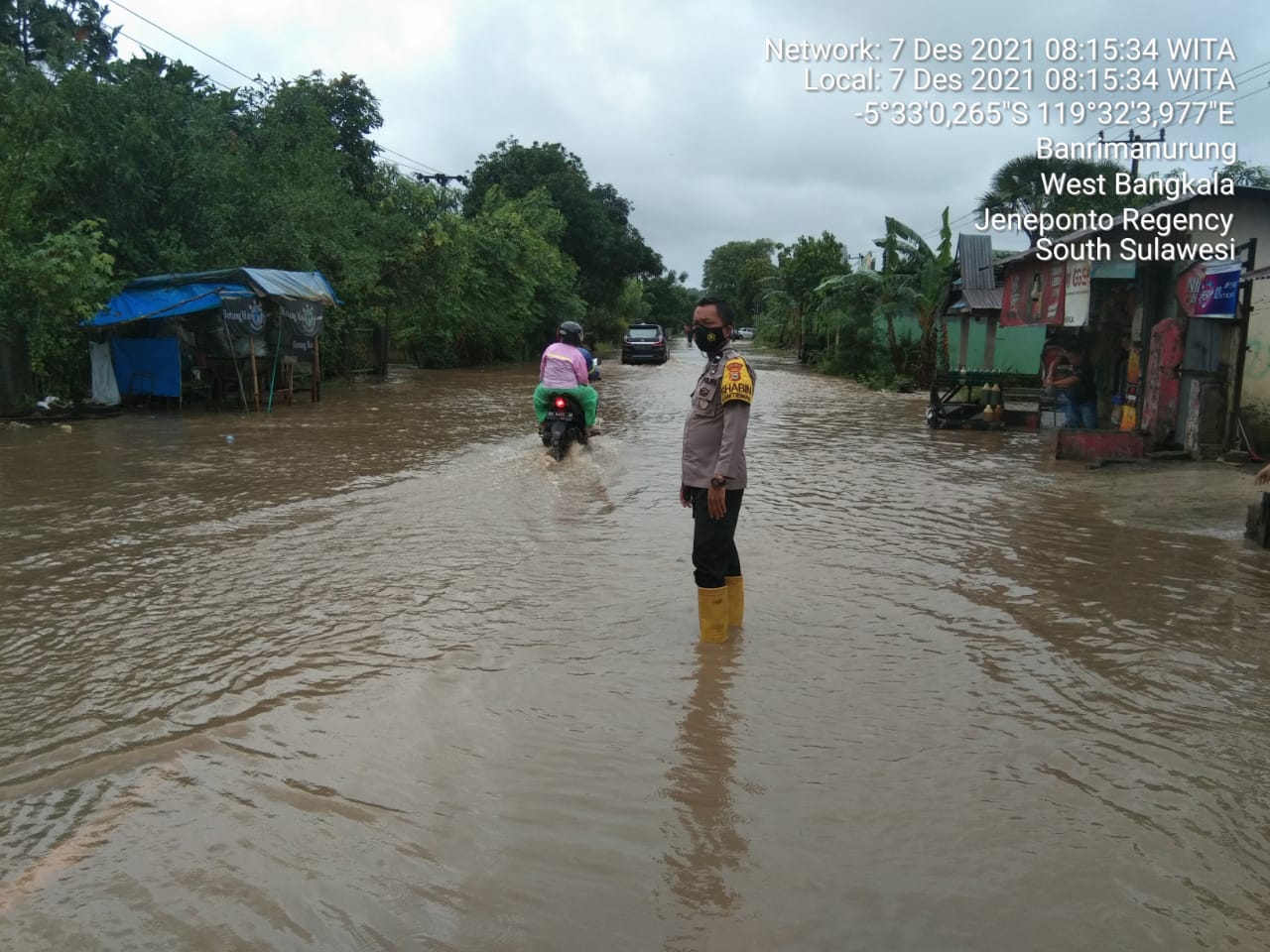 Bhabinkamtibmas desa banrimanurung Aipda Rustam melaksanakan patroli sambang kunjung kerumah warga binaan dalam kesempatan itu juga bhabinkabtimas melaksanakan pemantauan ketinggian debit air yang sudah masuk di jalan poros teneponto takalar di kampung topa desa banrimanurung yang sudah memasuki badan jalan dengan ketinggian air sekitar 30 cm akan tetapi arus lalulintas masih lancar dan aman.