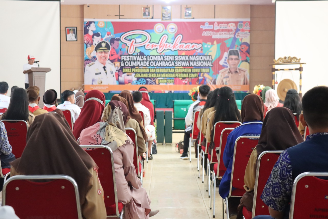 Luwu Timur, Chaneltimur.com – Kepala Dinas Pendidikan dan Kebudayaan (Disdikbud), La Besse didampingi Ketua Dewan Pendidikan Lutim, H. Ardias Bara, Sekertaris Disdikbud, H. Basruddin, serta Ketua Panitia, H. Sahabuddin, membuka secara resmi Festival dan Lomba Seni Siswa Nasional (FLS2N) dan Olimpiade Olahraga Siswa Nasional (O2SN) pada Jenjang Sekolah Menengah Pertama (SMP) Tahun 2022 se-Kabupaten Luwu Timur (Lutim), yang ditandai dengan pemukulan gong di Aula Disdikbud, Jumat (03/06/2022).