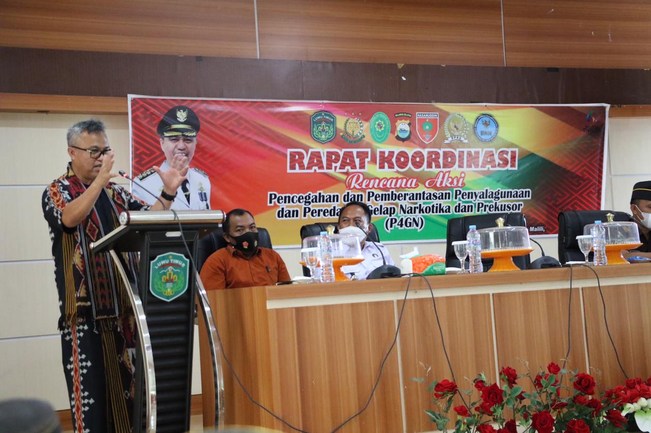 Luwu Timur,Chaneltimur.com – Dalam rangka Pencegahan dan Pemberantasan Penyalagunahan dan Peredaran Gelap Narkotika dan Prekursor Narkotika (TP4GN), Bupati Luwu Timur (Lutim), H. Budiman bersama Forum Koordinasi Pimpinan Daerah Kabupaten Luwu Timur, serta Ketua Badan Narkotika Nasional (BNN) Kota Palopo, menghadiri Rapat Koordinasi TP4GN di Aula Kantor Bupati, Kamis (10/03/2022).