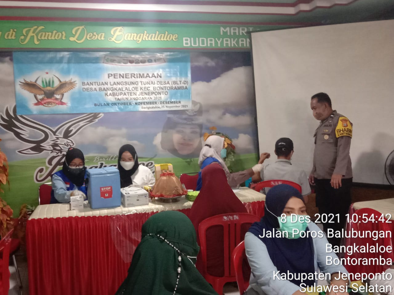 Bhabinkamtibmas Desa Bangkalaloe Aipda Safaruddin.Y bersama Babinsa Serda Tompo memantau pelaksanaan vaksinasi covid -19 tahap I dan II kepada warga Desa Bangkalaloe yang diselenggarakan oleh tim vaksinator dari Rsud Labuhan Baji Makassar bekerjasama dengan puskesmas Bontoramba.