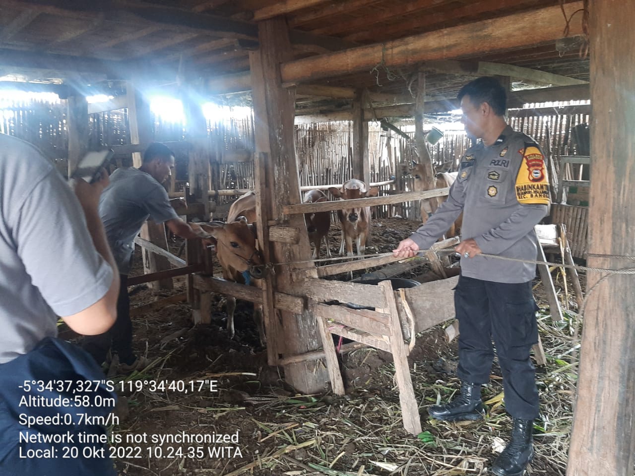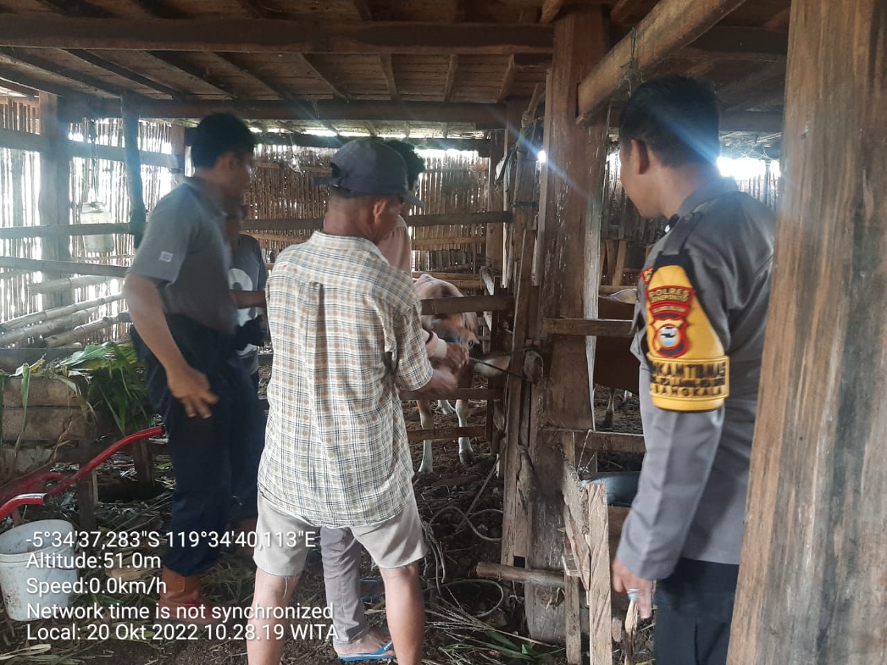 Bhabinkamtibmas Aipda Irwan Abbas bersama kepala desa kalimporo Hasbibi Arsyad mendampingi tim vaksinasi dari peternakan kabupaten jeneponto yang dipimpin oleh Drh. Nurliyani Samsu bersama anggotanya, Kamis/20/10/2022.