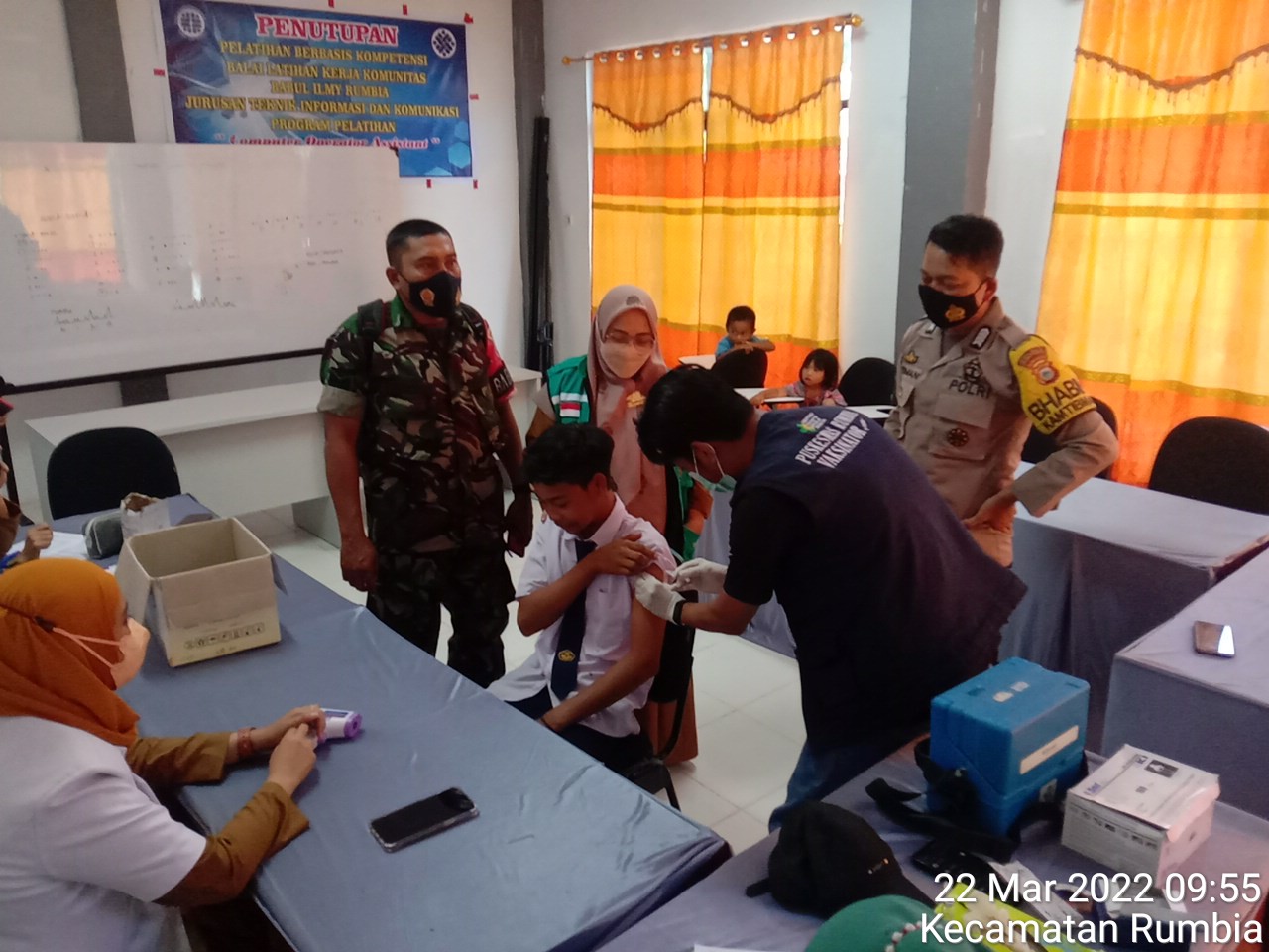 Jeneponto,Chaneltimur.Com – Di MIS Babul Ilmi dusun bontopanno desa rumbia kecamatan rumbia kabupaten jeneponto, kegiatan rutin bhabinkamtibmas Bripka Sufirman selain menyambangi warga binaannya juga rutin memantau setiap kegiatan yang terlaksana di desa binaannya tidak terkecuali kegiatan vaksinasi covid-19 yang kali ini terlaksana bagi anak usia 6-12 tahun maupun warga sekitar sekolah yang dapat terlaksana berkat kerjasama pemerintah desa dan puskesmas rumbia kabupaten jeneponto, Selasa 22/3/2022