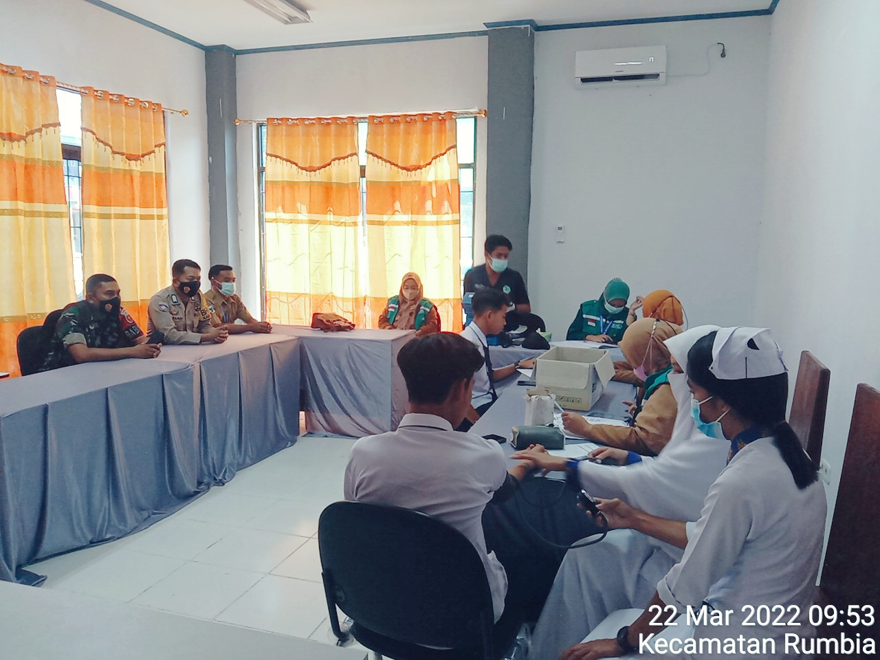 Kegiatan yang berlangsung dengan tetap menerapkan protokol kesehatan ketat sedangkan tim vaksinator yang turut membantu yakni dari nakes puskesmas rumbia disela pelaksanaan pemberian vaksinasi ini.
