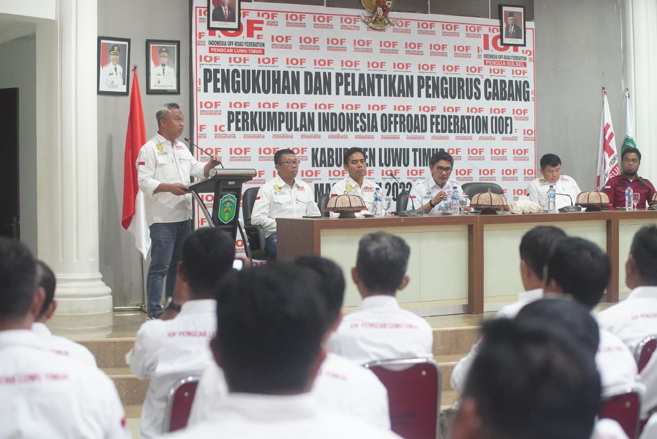 Luwu Timur, Chaneltimur.com – Ketua Pengda Indonesia Offroad Federation (IOF) Sulsel, Adi Rasyid Ali (ARA) mengukuhkan H. Budiman sebagai Ketua Pengurus Cabang (Pengcab) Indonesia Offroad Federation (IOF) Kabupaten Luwu Timur masa bakti 2022-2026 yang berlangsung di Aula rumah jabatan Bupati Luwu Timur, Jumat (26/08/2022) malam.