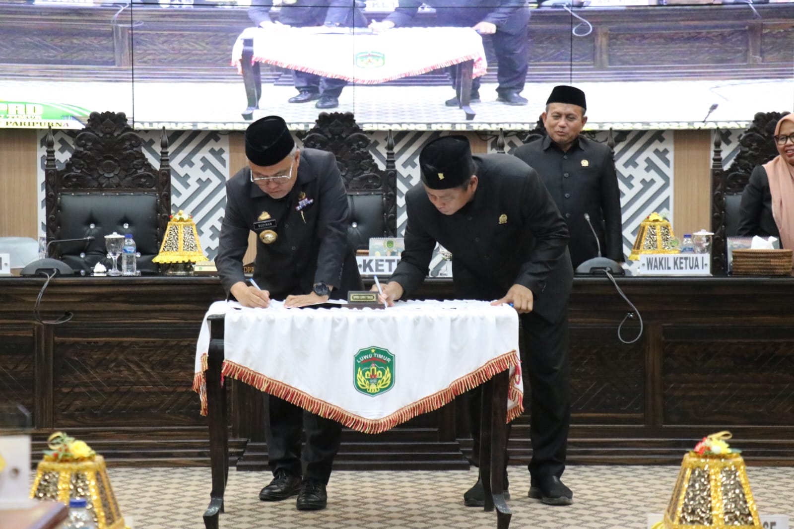 Usai menyampaikan pendapat akhirnya, Bupati Budiman bersama Ketua DPRD Lutim melakukan penandatangan persetujuan bersama terhadap Ranperda RTRW Kabupaten Luwu Timur Tahun 2024-2043.