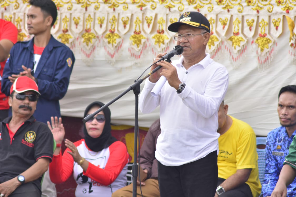 Dihadapan ribuan penonton, Bupati H. Iksan Iskandar menyampaikan salam hangat atas terselenggaranya acara pembukaan Turnamen Bola Karaeng Bonto Cup III