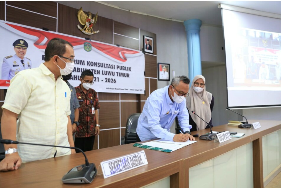 Bupati Luwu Timur dalam sambutannya mengatakan bahwa, Rancangan awal RPJMD dibahas bersama dengan para pemangku kepentingan melalui forum konsultasi publik untuk memperoleh masukan dan saran penyempurnaan, untuk selanjutnya akan dituangkan kedalam berita acara kesepakatan yang ditandatangani oleh setiap unsur yang mewakili pemangku kepentingan.
