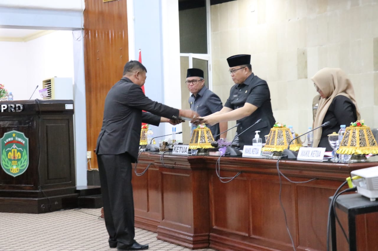 Usai menyampaikan sambutannya, Bupati Luwu Timur, H. Budiman menyerahkan Rancangan KUA dan PPAS TA. 2023 Kabupaten Luwu Timur kepada Ketua DPRD Luwu Timur, Aripin untuk dibahas dalam waktu yang tidak lama dan disetujui bersama sesuai dengan peraturan perundang-undangan.