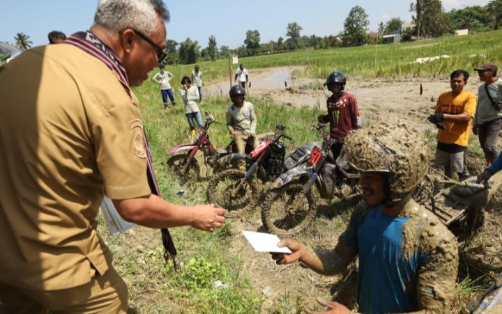 Setelah menyampaikan sambutannya, Bupati secara simbolis menyerahkan bantuan Bibit padi Unggul dan Pupuk Organik kepada perwakilan kelompok tani dan dilanjutkan dengan menyaksikan balap ojek gabah yang memperebutkan hadiah utama sepeda motor dan hadiah menarik lainnya.