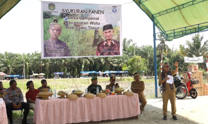 Dalam sambutannya, Bupati H. Budiman menyampaikan ucapan rasa syukur dan apresiasi atas panen raya padi warga Desa Lampenai sebagai bagian dari kontribusi nyata para petani dalam peningkatan produksi dan produktivitas pertanian di Luwu Timur.