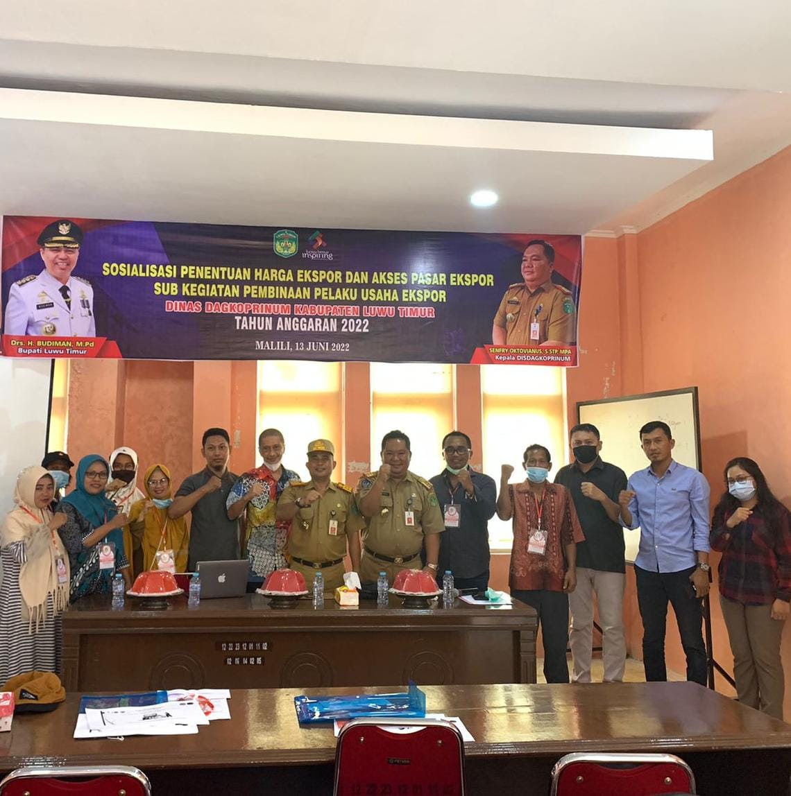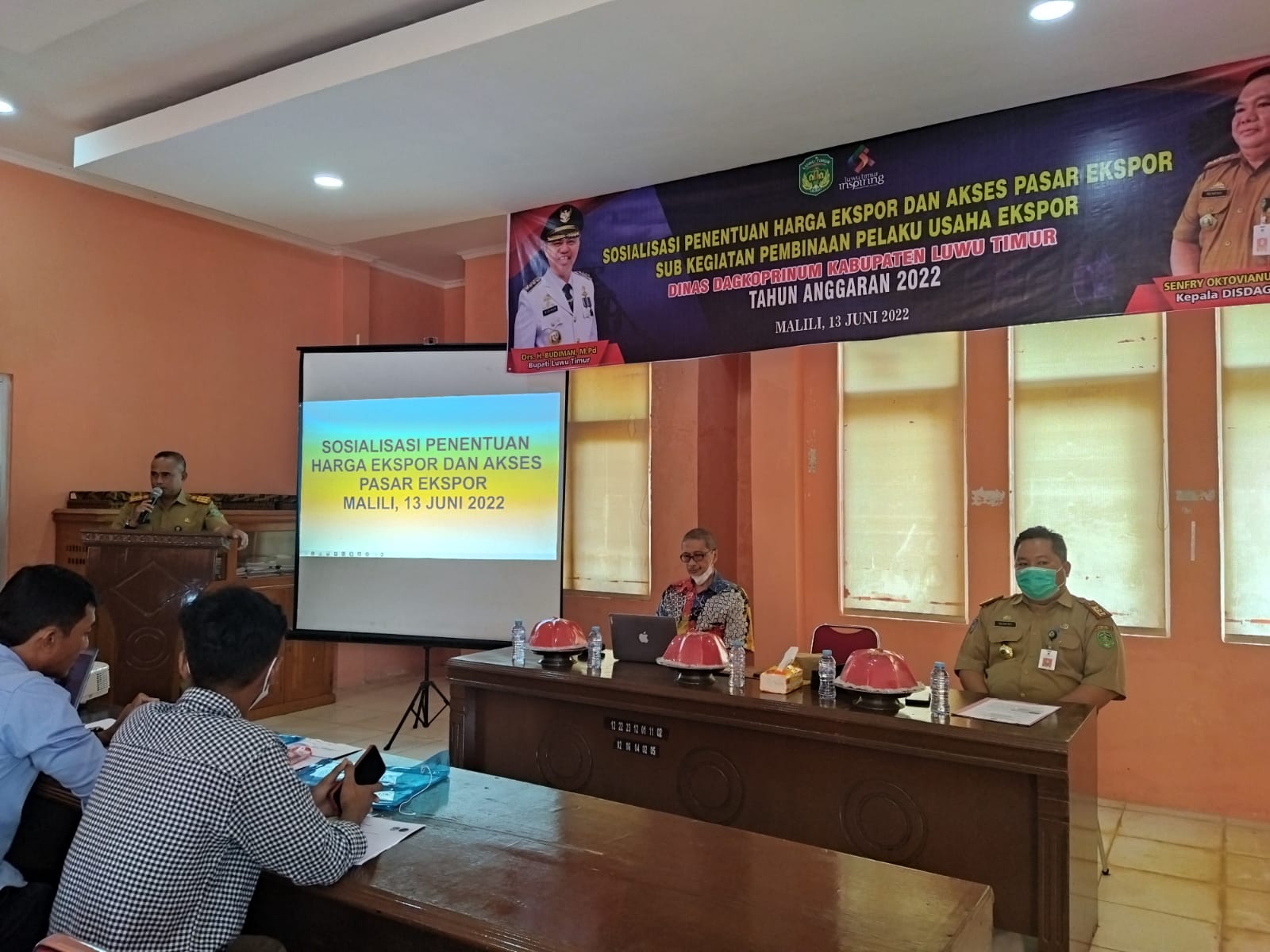 Luwu Timur, Chaneltimur.com – Pemerintah Kabupaten Luwu Timur melalui Dinas Perdagangan, Koperasi Perindustrian dan UKM (Disdagkoprinum) menggelar Sosialisasi Penentuan Harga Ekspor dan Akses Pasar Ekspor Tahun Anggaran 2022 bertempat di Aula Kantor Dinas Dagkoprinum Kab. Luwu Timur, Senin (13/06/2022).