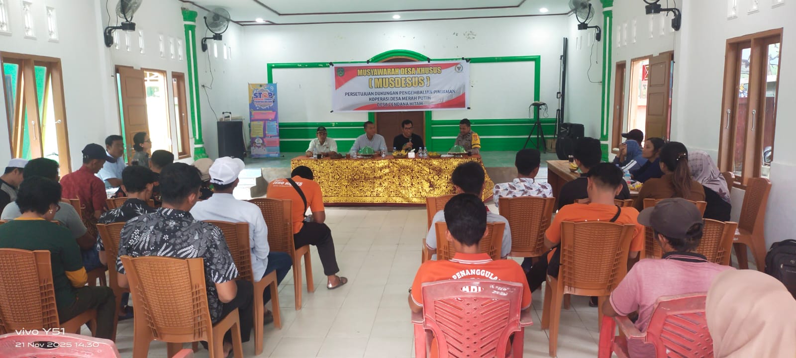 Luwu Timur, Chaneltimur.com – Dua desa di Kecamatan Tomoni Timur, Kabupaten Luwu Timur yakni Desa Cendana Hitam dan Desa Kertoraharjo menggelar Musyawarah Desa Khusus (Musdesus) persetujuan dukungan pengembalian pinjaman Koperasi Desa Merah Putih (KDMP), Jumat (21/11/2025). Musyawarah berlangsung di kantor desa masing-masing.
