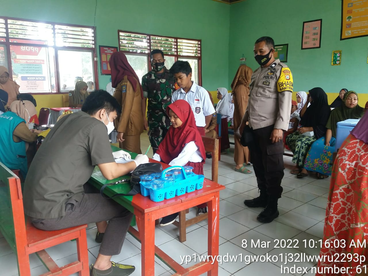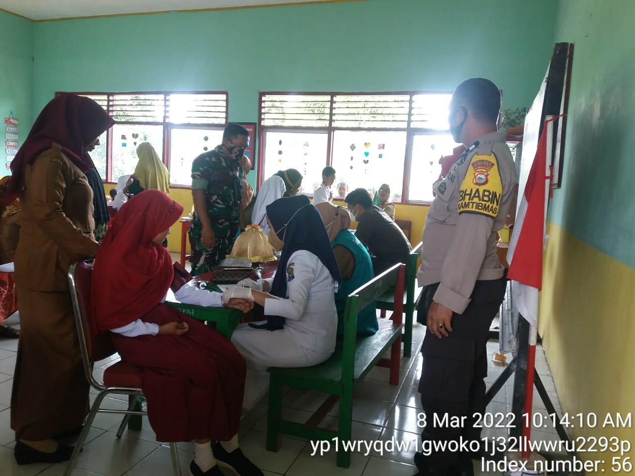 bhabinkamtibmas kel tolo timur dan kel tolo utara Aiptu Palinggi bersama babinsa Serda Basri melaksanakan pendampingan nakes tim vaksinator puskesmas tolo yang bertugas memberi vaksin bagi anak usia 6-11 tahun terkhusus bagi siswa SDI 240 karampuang, Selasa 8/3/2022.