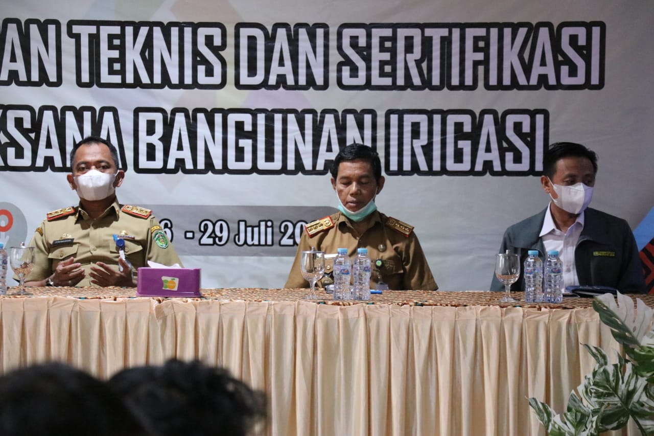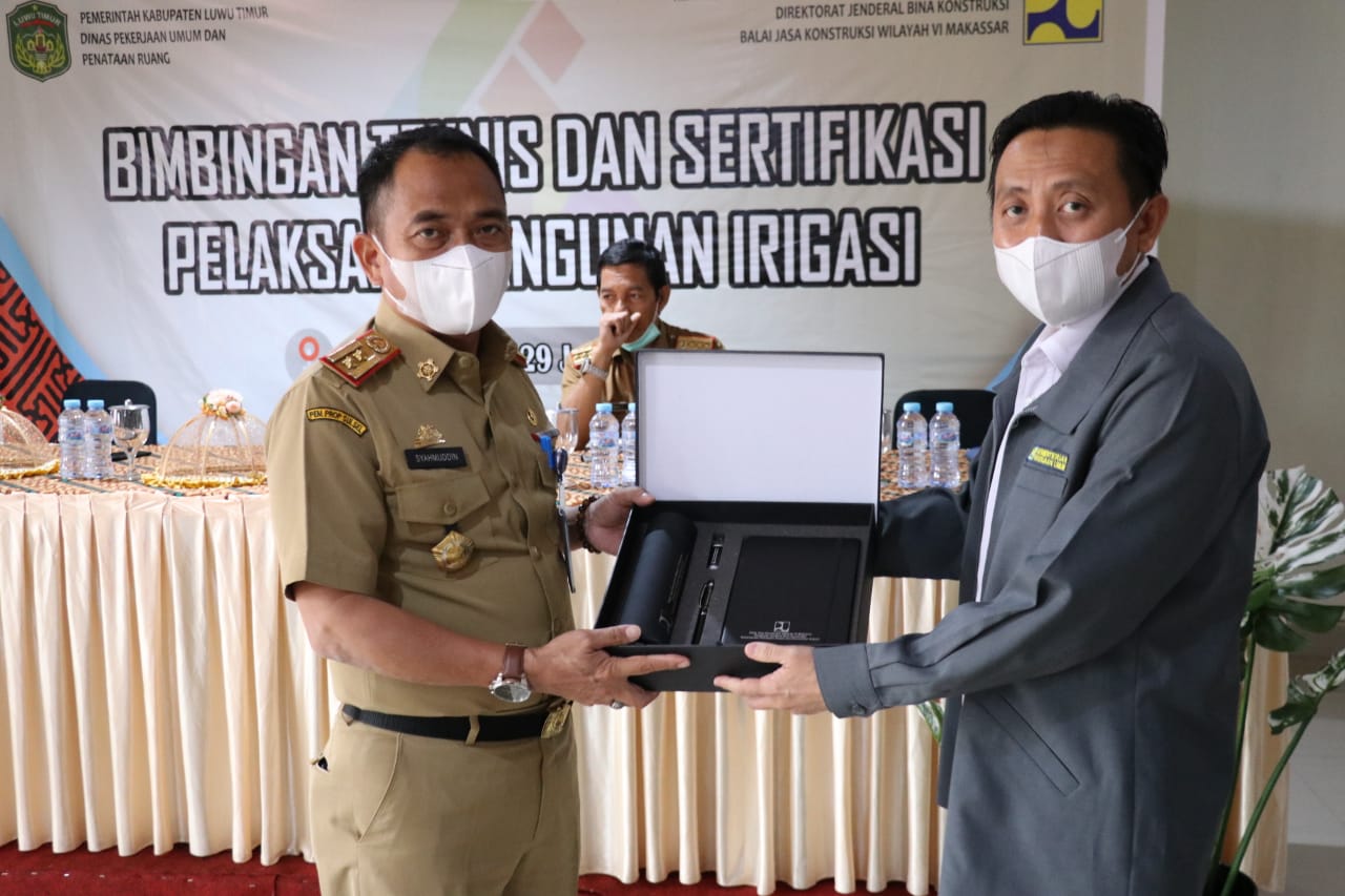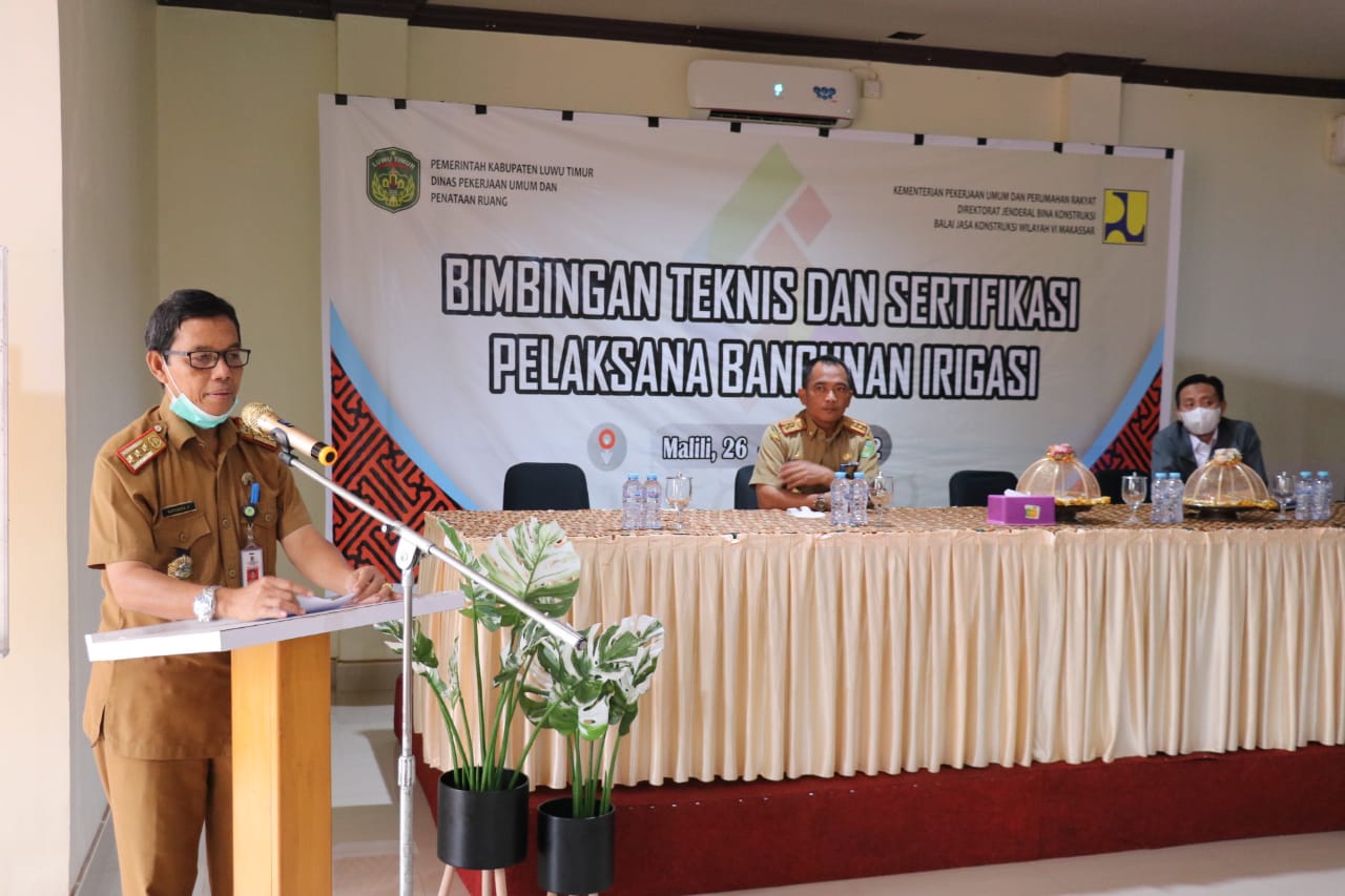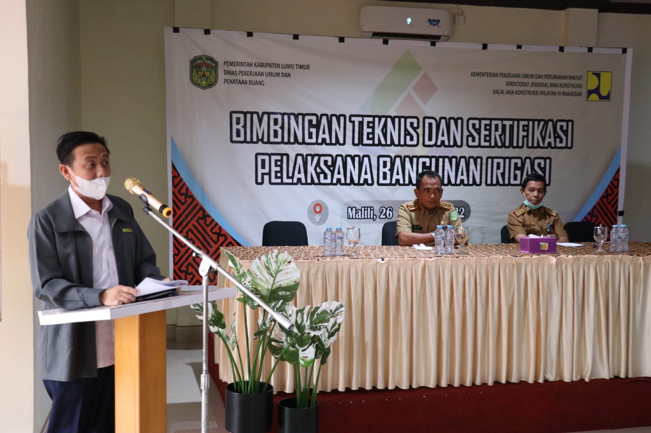 Luwu Timur, Chaneltimur.com – Dinas Pekerjaan Umum dan Penataan Ruang (PUPR) Kabupaten Luwu Timur bekerjasama Balai Jasa Konstruksi Wilayah VI Makassar, menggelar Bimbingan Teknis (Bimtek) dan Sertifikasi Pelaksana Bangunan Irigasi (PBI), di Aula Hotel I Lagaligo Malili, Selasa (26/07/2022).