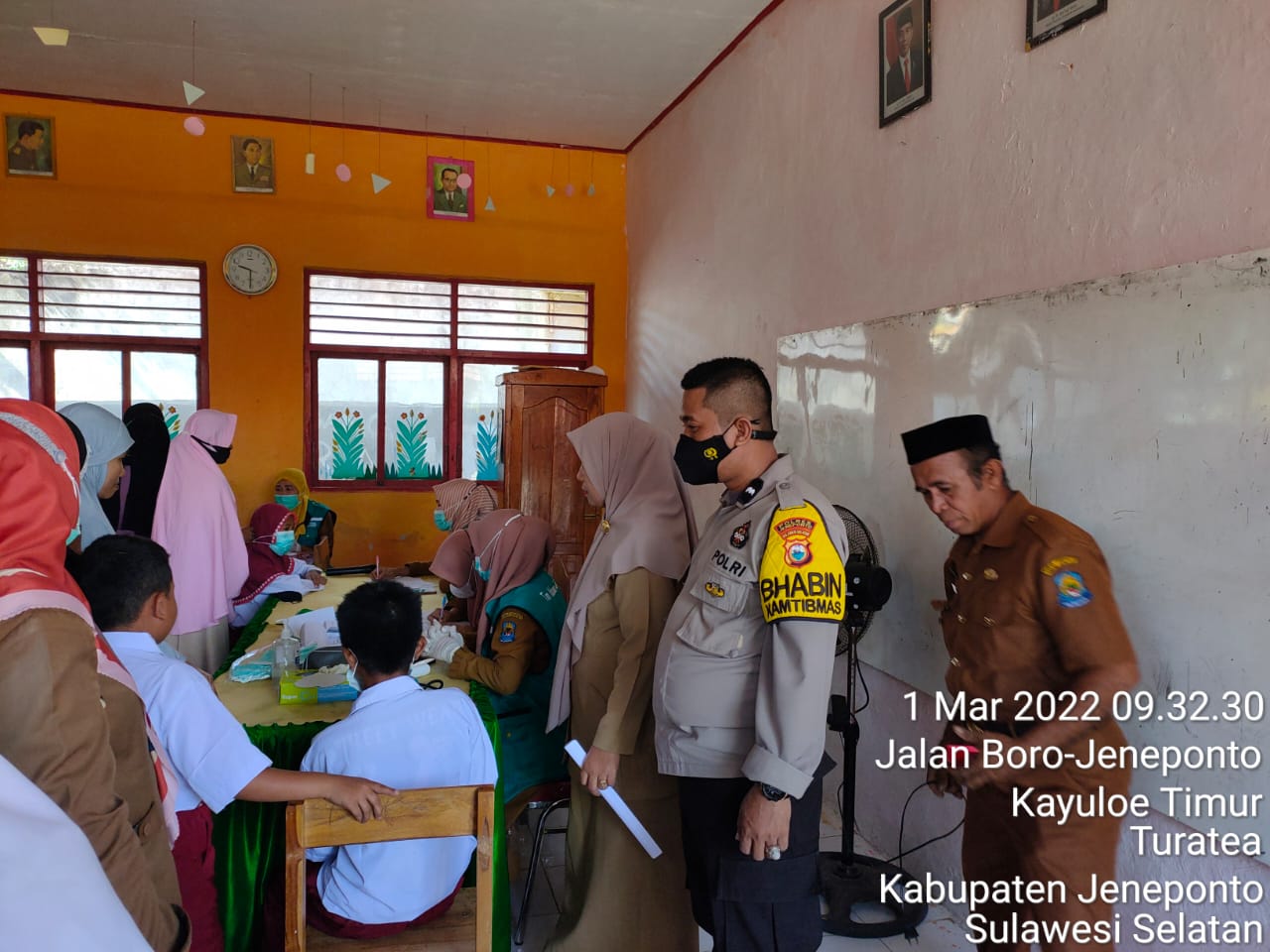 Jeneponto,Chaneltimur.Com – Berlokasi di dusun ganrangbatu utara desa kayuloe timur kec turatea kab jeneponto,bhabinkamtibmas Aipda Asri Jaya mementau pelaksanaan vaksinasi covid-19 secara massal di Upt SD Neg NO.5 turatea. Selasa (1/3/2022)