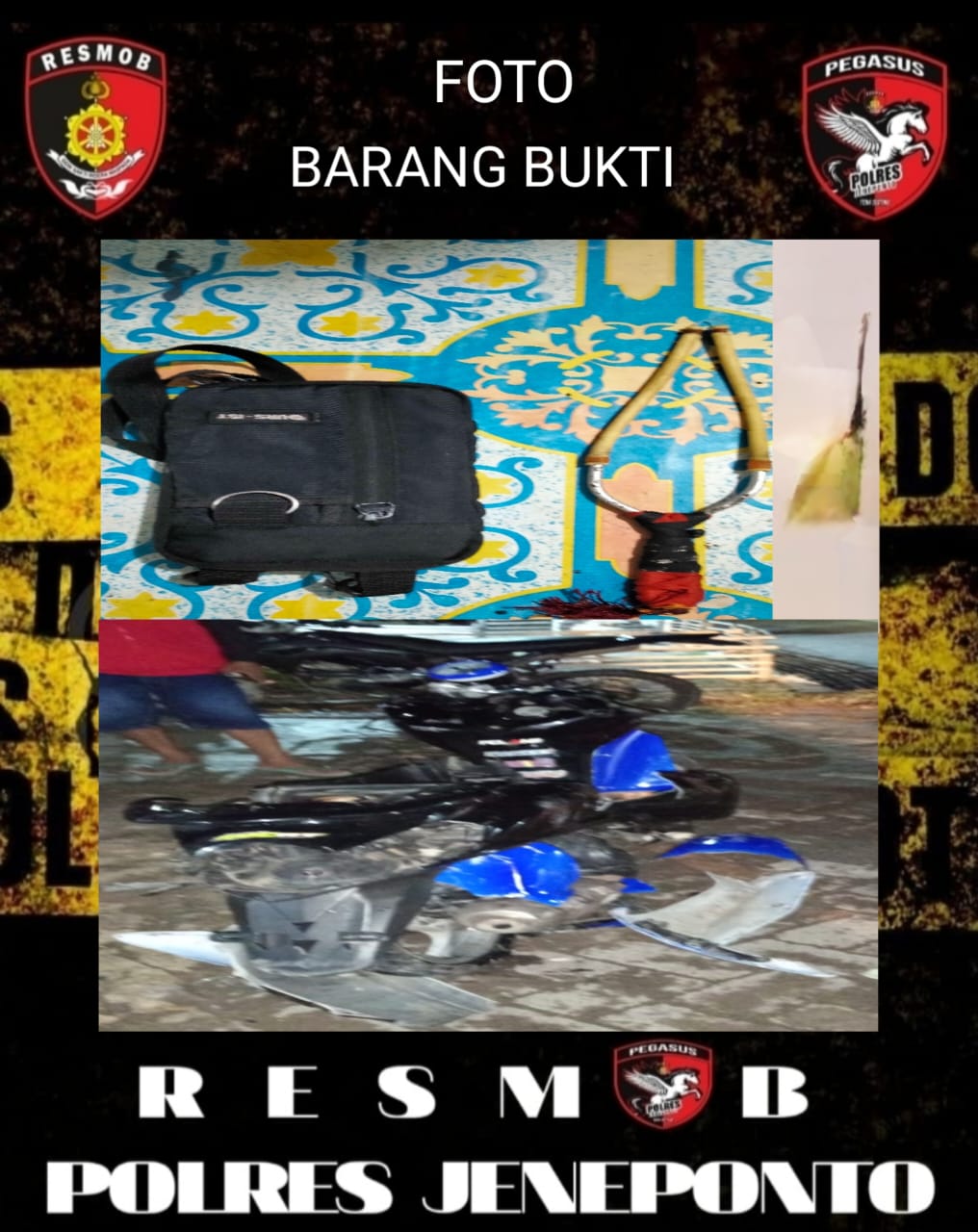Polisi menyita sejumlah barang bukti, antara lain 1 unit sepeda motor tanpa plat nomor, 1 buah anak panah busur, 1 buah ketapel/pelontar serta 1 buah tas slempang warna hitam.