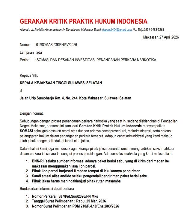 Sulsel, Chaneltimur.com – Gerakan Kritik Praktik Hukum Indonesia resmi melayangkan somasi dan desakan investigasi kepada Kejaksaan Tinggi Sulawesi Selatan terkait penanganan perkara narkotika yang sedang disidangkan di Pengadilan Negeri Makassar.