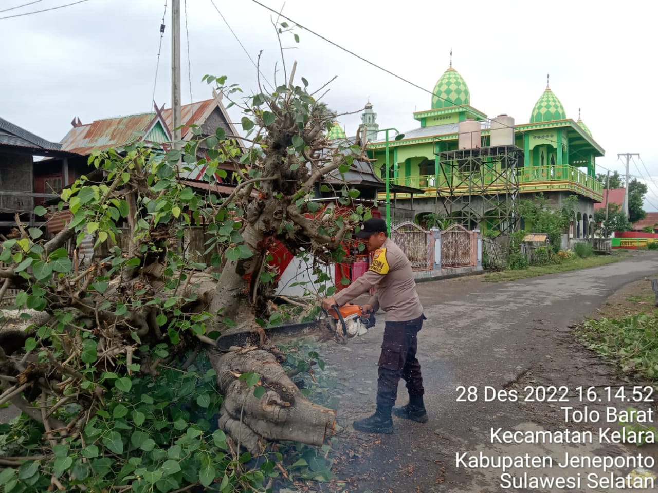 Bhabinkamtibmas Aipda M.Arif melaksanakan patroli ke wilayah binaan tepatnya di lingkungan borongloe kelurahan tolo barat kecamatan kelara dan akan memonitor giat masyarakat dalam perjalanan saat melintas di desa menemukan pohon tumbang akibat hujan angin karena posisi pohon tumbang tersebut cukup membahayakan pengguna jalan,Aipda M.Arif segera menghubungi aparat desa untuk segera ketempat yang dimaksud dengan membawa peralatan pemotongan kayu sensaw dan parang untuk segera dilakukan perbersihan bersama warga masyarakat yang sedang melintas.