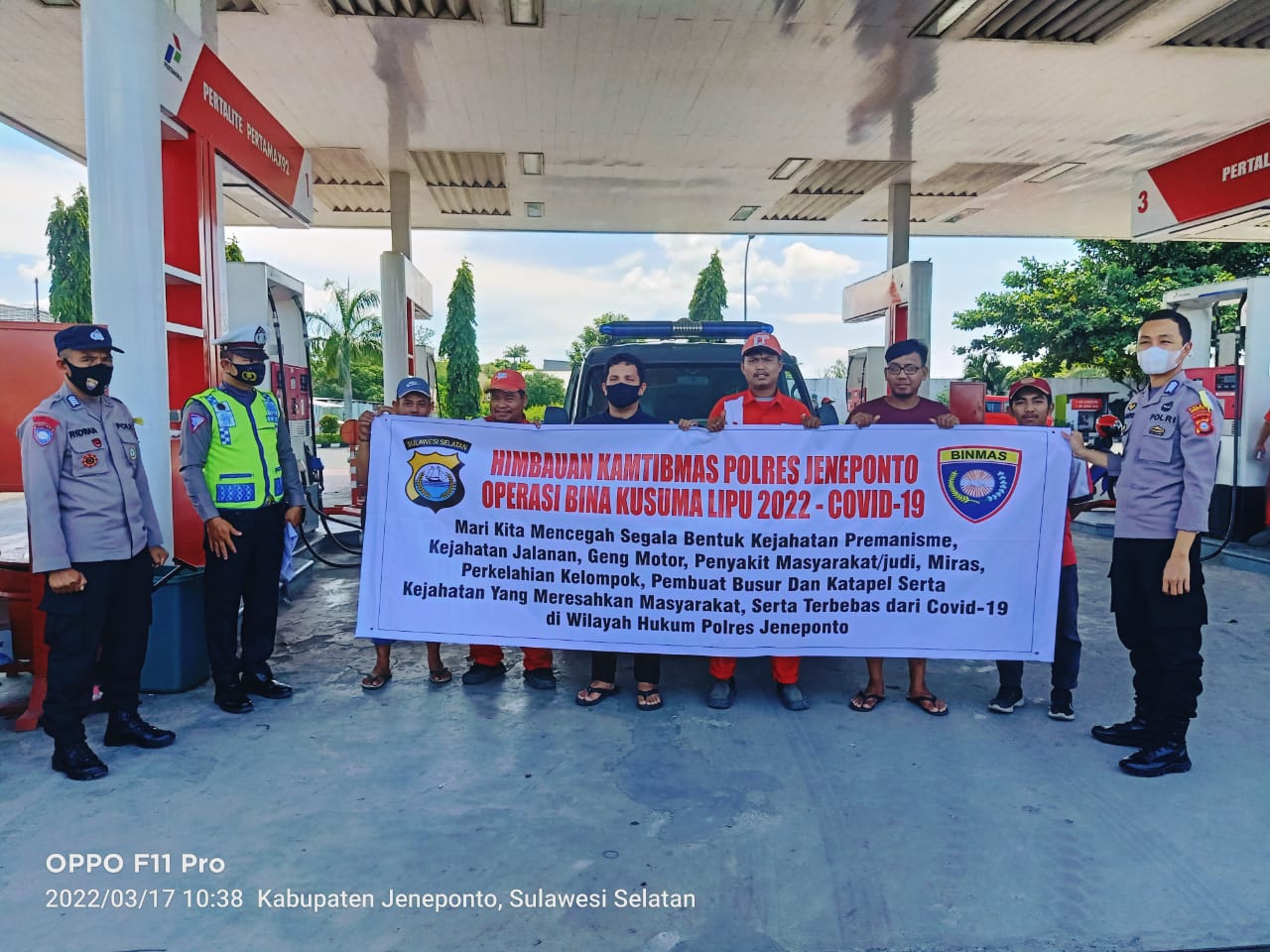 Jeneponto,Chaneltimur.Com – Personil yang tergabung dalam ops bina kusuma polres jeneponto melaksanakan aksi kegiatanya dalam bentuk sosialisasi dan himbauan yang dipimpin oleh kasat binmas polres jeneponto Akp Bakri,S.Sos., MM, di Kantor BRI Cab Jeneponto dan juga di Spbu Mangga Kulle Kel Empoang, Kec Binamu Kab Jeneppnto Kamis 17/3/2022