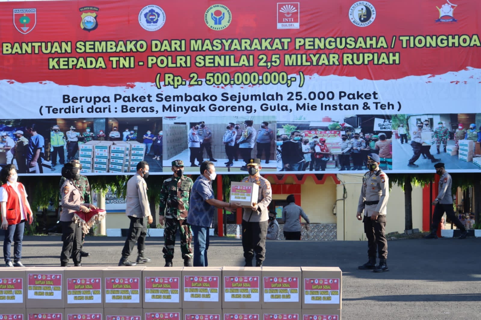 Sulsel,Chaneltimur.com – Kapolda Sulawesi Selatan (Sulsel), Irjen Pol Merdisyam bersama Pangdam XIV Hasanuddin Mayjen TNI Mochamad Syafei Kasno menerima bantuan 25 Ribu paket Sembako dari Masyarakat Pengusaha Tionghoa Sulsel untuk didistribusikan kepada masyarakat terdampak pemberlakuan PPKM di wilayah Sulsel, Senin (30/8/2021) di Lapangan Hitam SPN Batua Makassar.