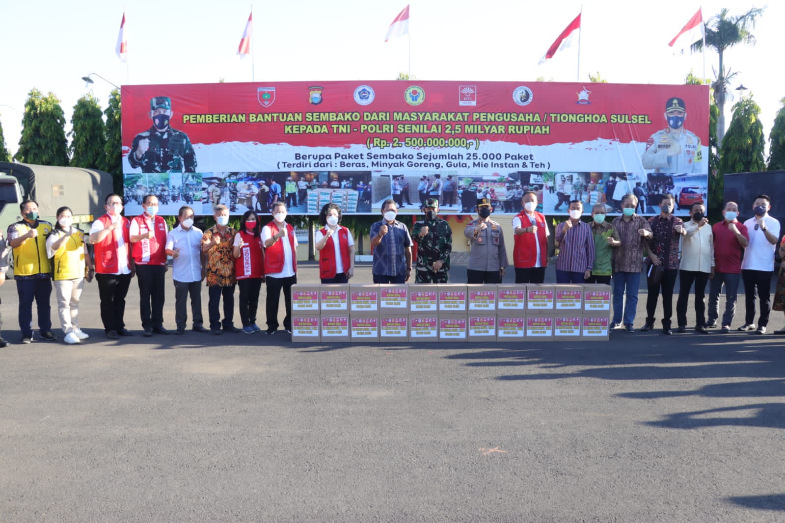Diketahui , Total bantuan tersebut sebanyak 25 Ribu paket Sembako bernilai 2,5 Milyar rupiah dan bantuan tersebut dalam setiap paketnya terdiri dari Beras, Minyak Goreng, Gula Mie Instan dan teh