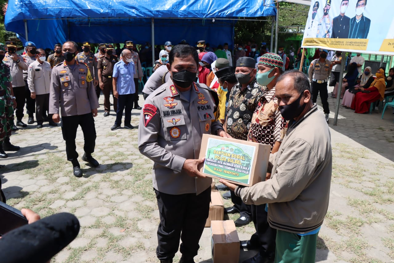 Setelah penyampaian sambutan kemudian Bapak Kapolda Sulsel bersama dengan forkopimda Kab. Jeneponto serta Ibu Ketua Bhayangkari Sulsel menyerahkan secara simbolis paket sembako kepada perwakilan warga masyarakat yang divaksin.