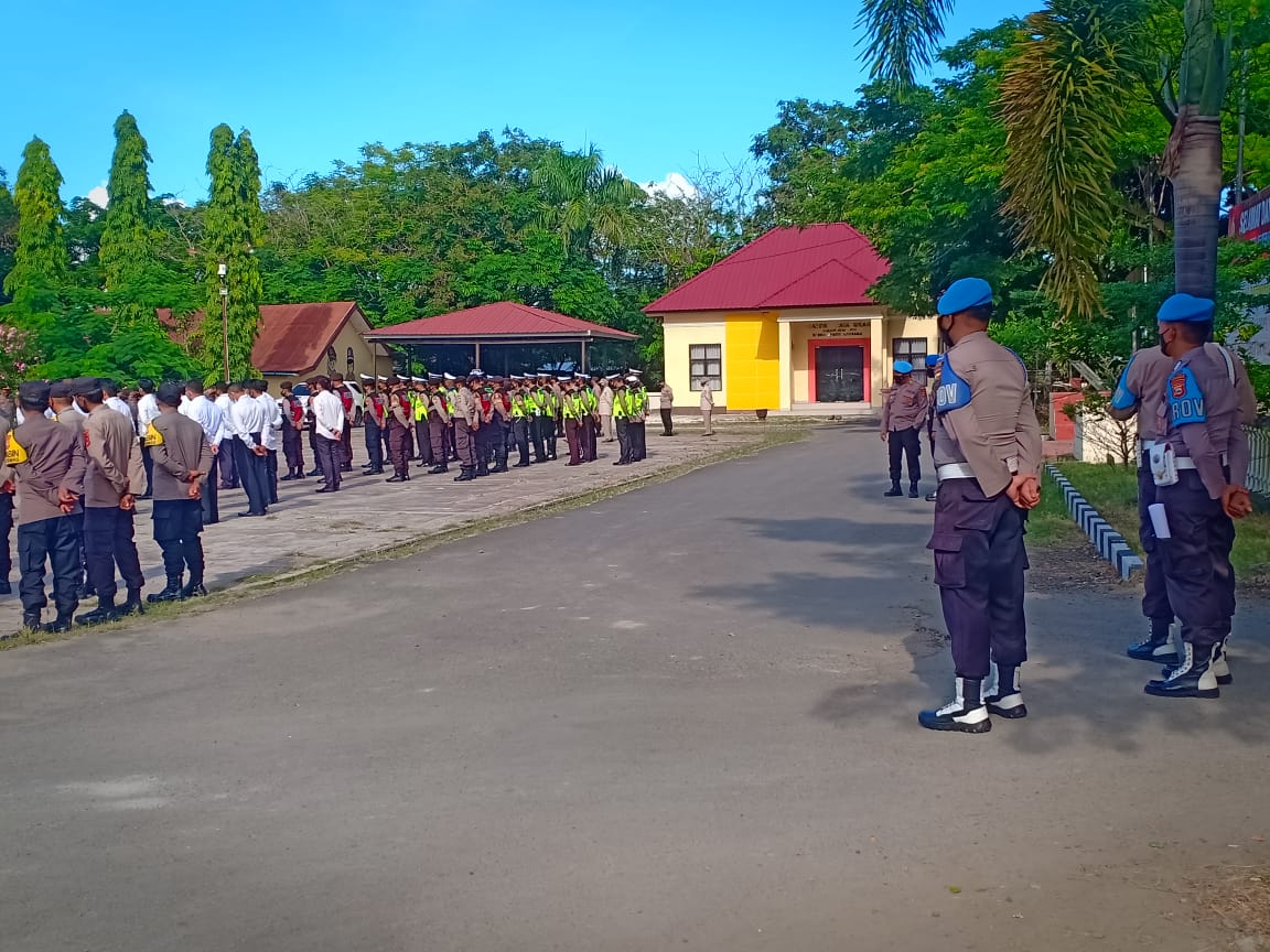 Diawali dengan laporan masing-masing satuan/bagian di lanjukan dengan pengucapan tribrata dan catur prasetya oleh personil satuan samapta Bripka Kaharuddin dan Bripka Ilyas