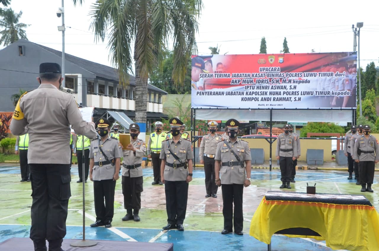 Luwu Timur, Chaneltimur.com – Kapolres Luwu Timur AKBP Indratmoko S.ik, memimpin pelaksanaan Sertijab sejumlah Pejabat Utama (PJU) dan Kapolsek di Halaman Mako Polres Luwu Timur. Senin(01/03/2021).