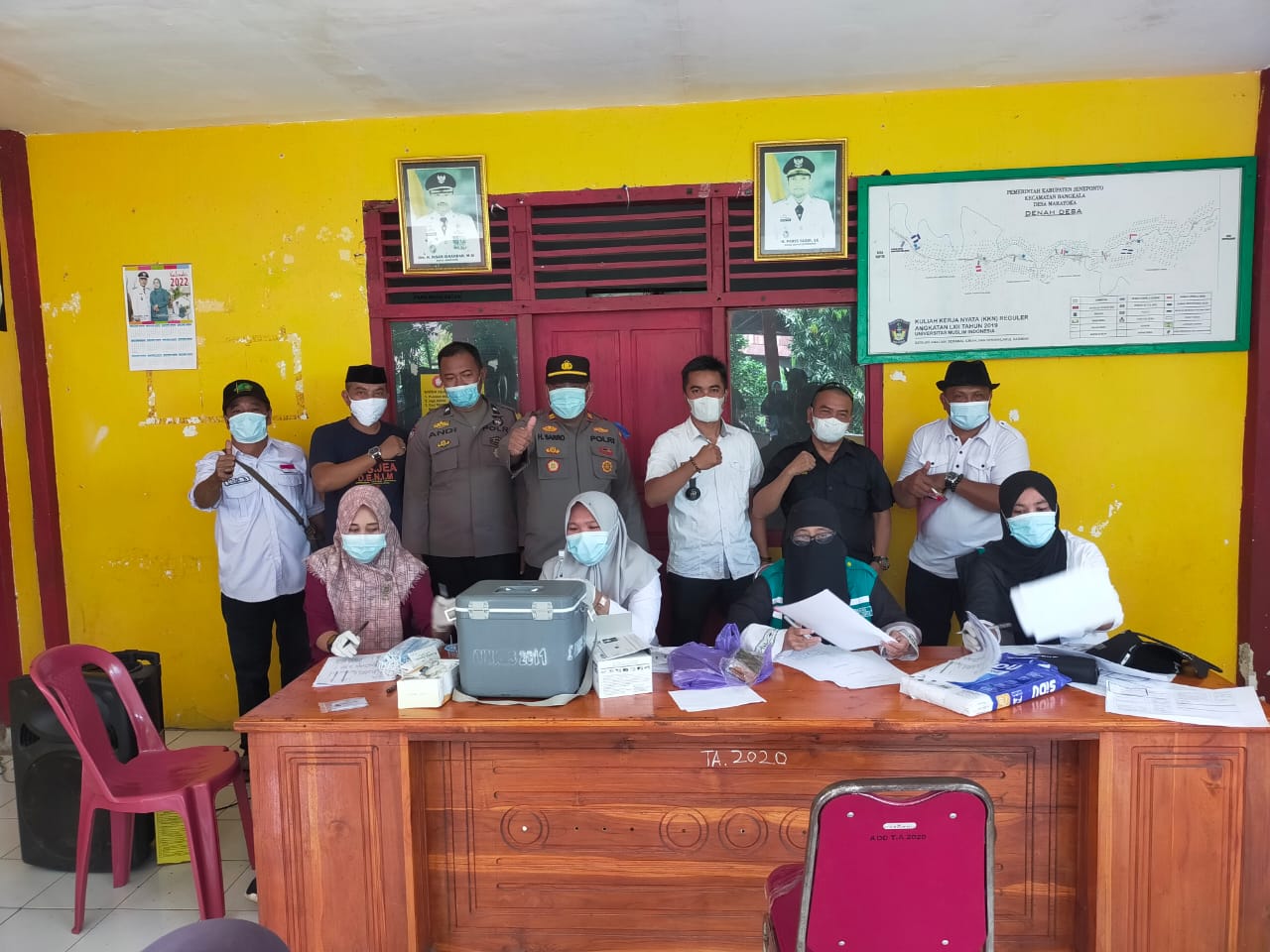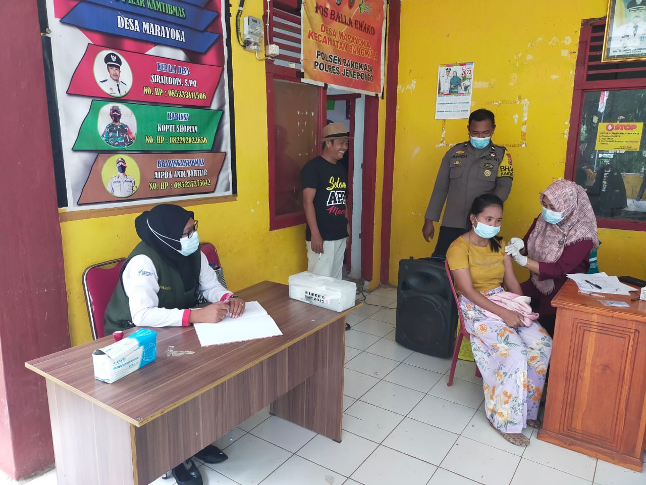 bhabinkamtibmas Aipda Alim Bachtiar melaksanakan pemantauan dan pengamanan pelaksanaan vaksinasi covid-19 di kantor desa marayoka.Dusun Bonto Lebang Kec Bangkala Kab Jeneponto Rabu (9/3/2022)