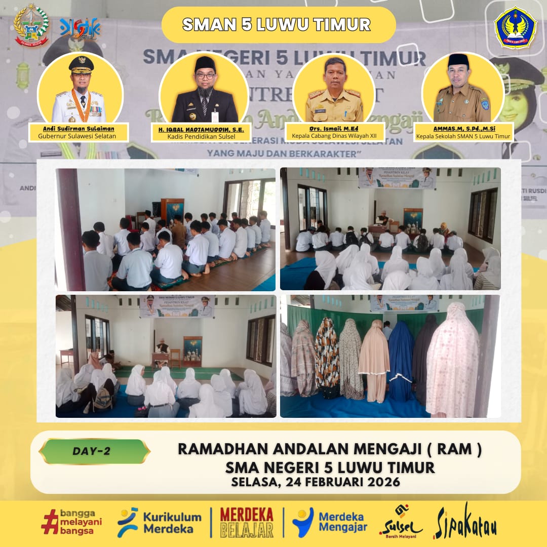 Kegiatan Ramadhan Andalan Mengaji (RAM) SMA 5 Luwu Timur telah berlangsung dari tanggal 23-27 Februari 2025. Acara pembukaan dilakukan secara virtual oleh Gubernur Sulawesi Selatan, Andi Sudirman Sulaiman.