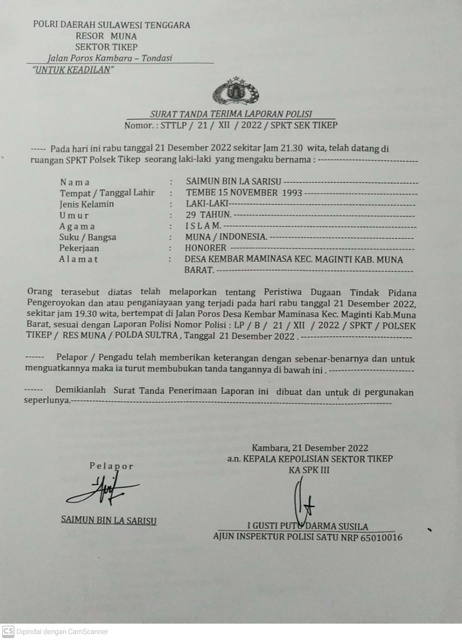 Diketahui hal ini sudah dilaporkan ke Mapolsek Tiworo Kepulauan dibuktikan dengan Laporan Polisi Nomor Polisi : LP/B/21/XII/2022/SPKT/POLSEK TIKEP/RES MUNA/ POLDA SULTRA, Tanggal 21 Desember 2022.