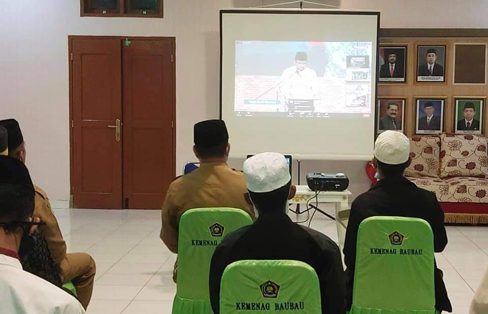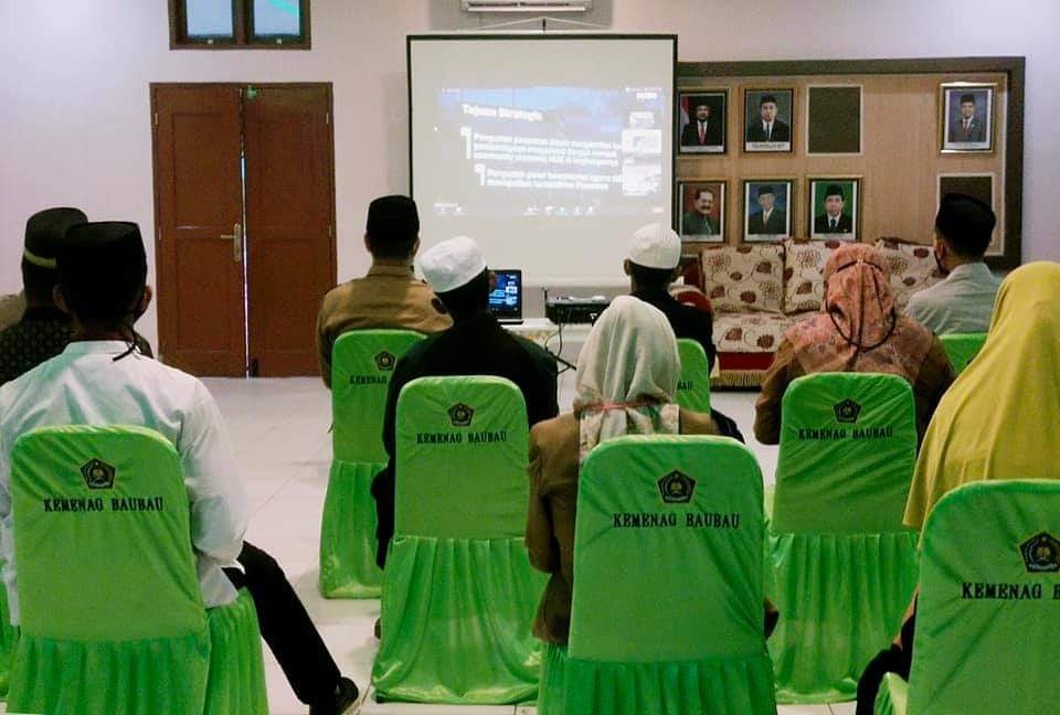 Chaneltimur.com. Baubau, Sultra- Kepala Kantor Kementerian Agama (Ka Kan Kemenag) Kota Baubau, Sulawesi Tenggara (Sultra) didampingi Pelaksana Tugas Kasubbag Tata Usaha (Plt Kasubbag TU) dan Kepala Seksi Pendidikan Agama dan Keagamaan Islam (Kasi Pakis) Kan Kemenag Kota Baubau bersama sejumlah pimpinan Pondok Pesantren (Ponpes) di Kota Baubau ikuti secara Virtual melalui zoom Meeting “Launching Peta Jalan Kemandirian Pesantren”, Aula Muirun Awi Kantor Kemenag Kota Baubau, Selasa, 4 Mei 2021.