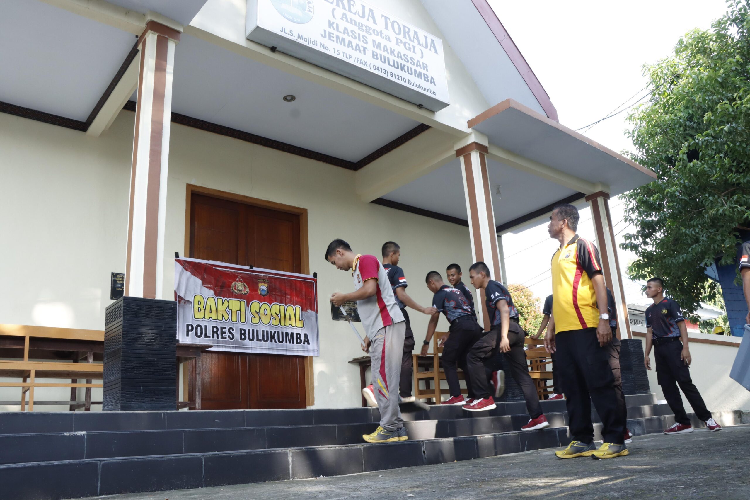 Kasi Humas Polres Bulukumba AKP H.Marala menjelaskan personel dari Polres bersama Polsek Ujung Bulu melaksanakan kerja bakti atau korvey membersihkan di Gereja Toraja di Jl.S.Majidi Kelurahan Loka Kecamatan Ujung Bulu.
