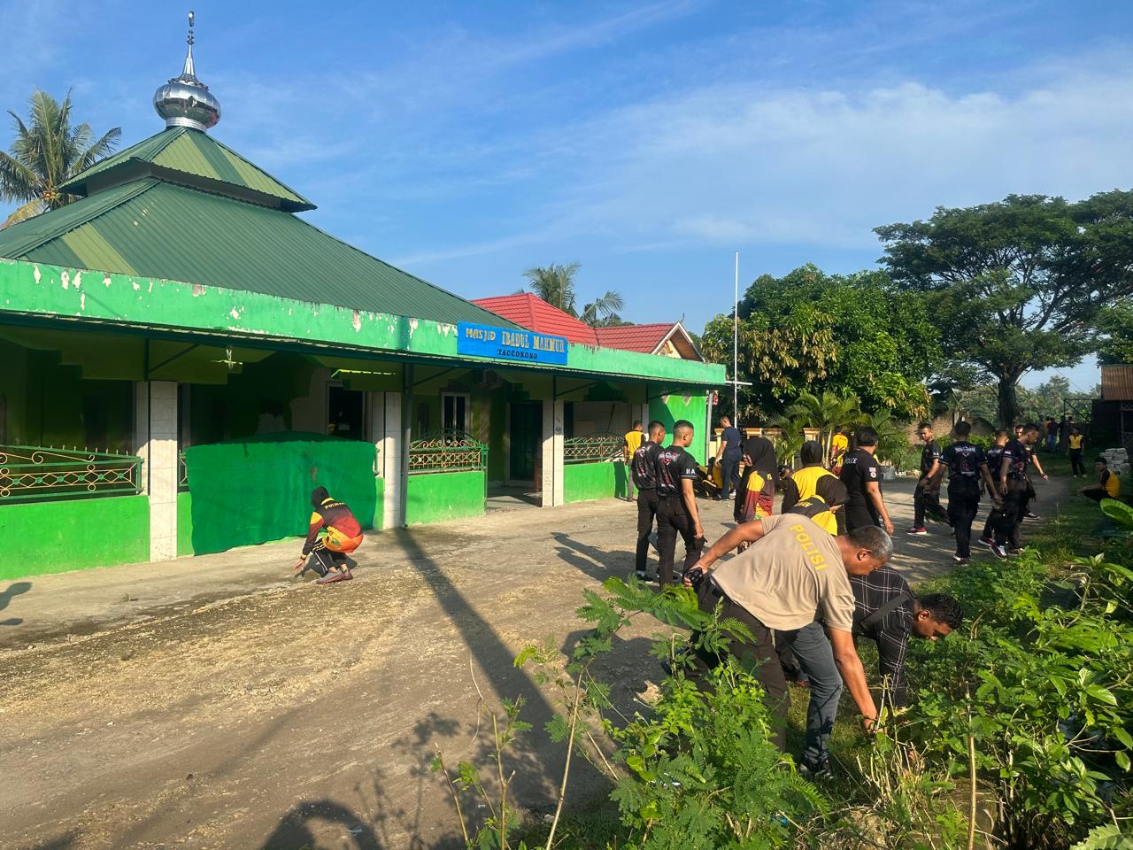 Personel secara bergotong royong membersihkan teras Masjid dan mencabut rumput dihalaman masjid, sementara di Gereja Toraja personel membersihkan teras dan halaman gereja.