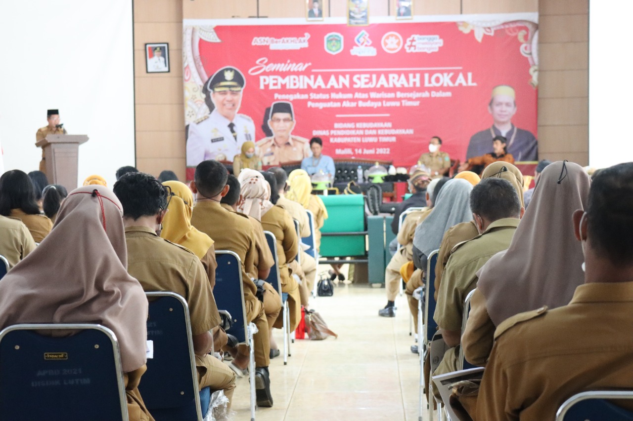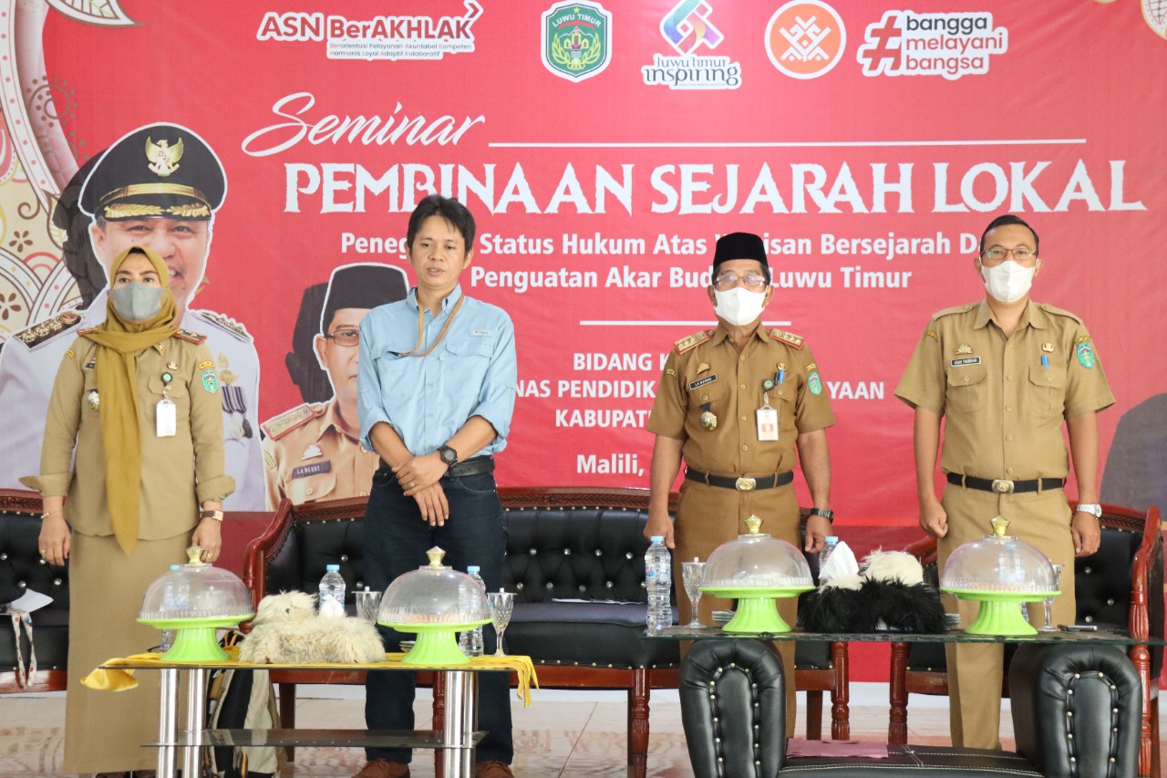 Luwu Timur, Chaneltimur.com – Kepala Dinas Pendidikan dan Kebudayaan (Disdikbud) Kabupaten Lutim, La Besse mewakili Bupati Luwu Timur didampingi Kabid Kebudayaan, Zulhidayah, Pamong Budaya Ahli Muda, Iswadi, Sekdis Parmudora, Agus Thobarani, serta Macoa Bawalipu, Bau Muh. Aras Abdi To Baji Pua Sinri, membuka Seminar Pembinaan Sejarah Lokal dengan tema “Penegakan Status Hukum Atas Warisan Bersejarah Dalam Penguatan Akar Lutim” yang diselenggarakan oleh Disdikbud di Aula Kantor Disdikbud, Selasa (14/06/2022).