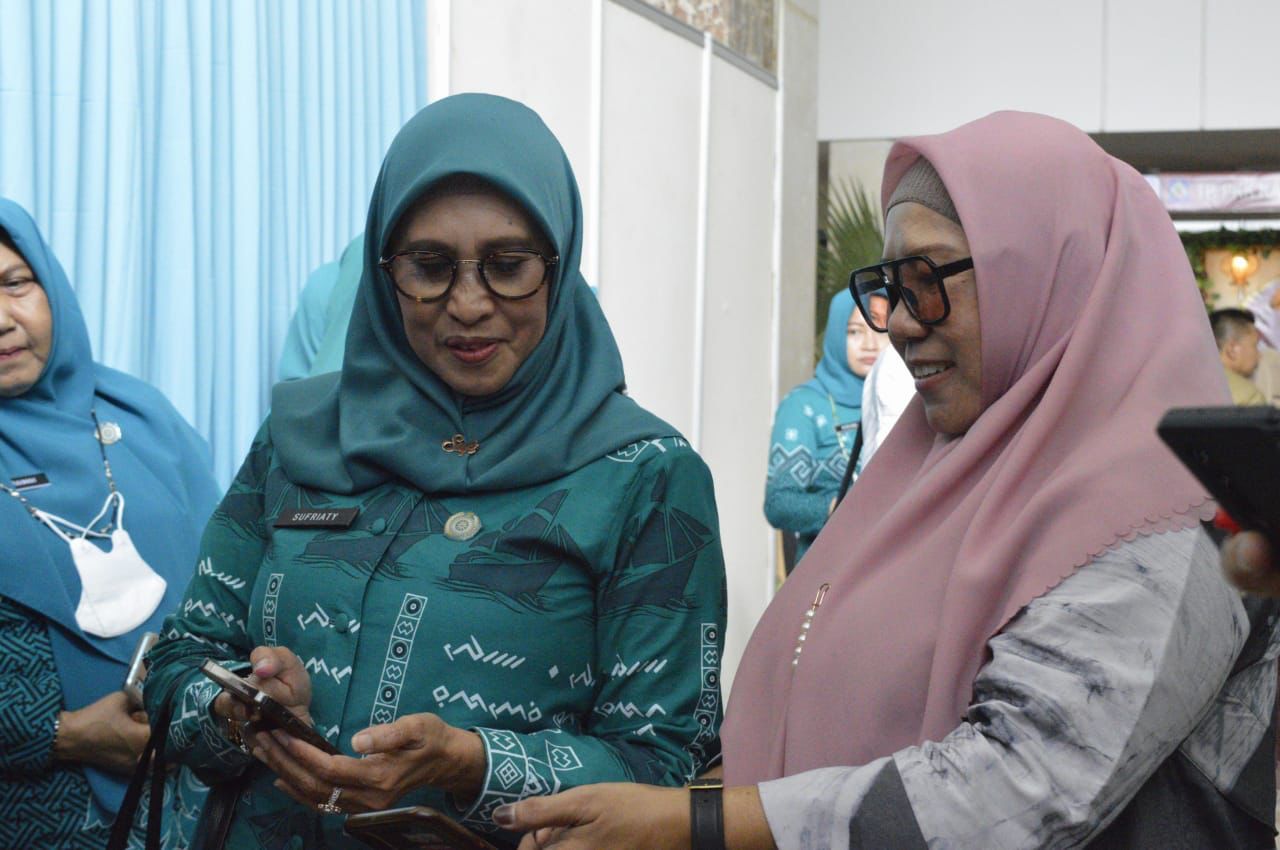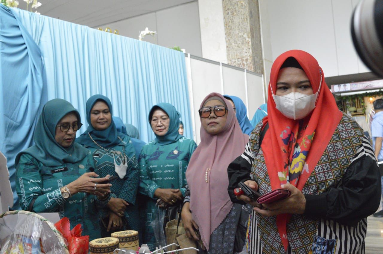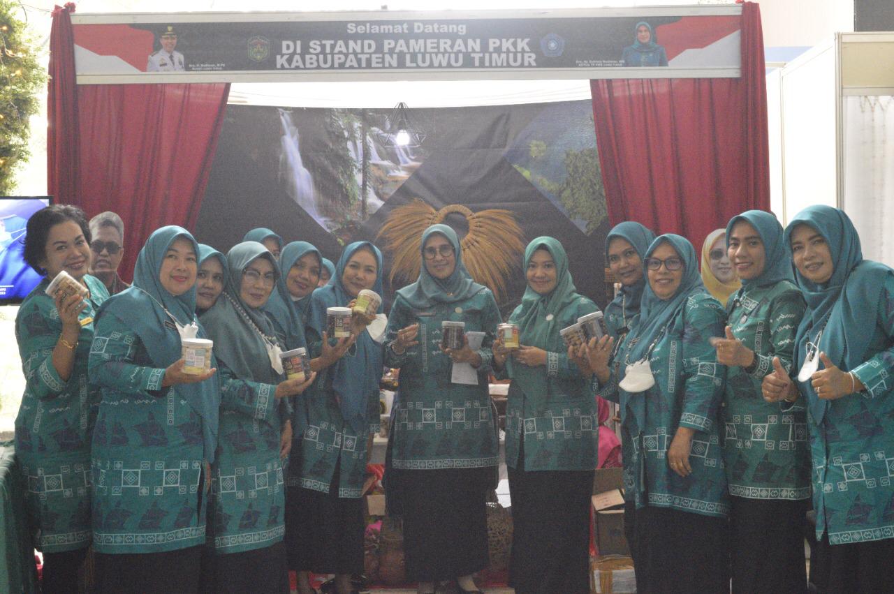 Kunjungan Janna Zana disambut langsung oleh Ketua TP PKK Lutim, Hj. Sufriaty Budiman bersama jajaran di depan stand pameran Kabupaten Lutim.