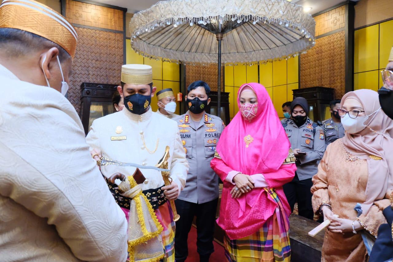 Pantauan Peliput, terlihat juga dalam penyambutan, payung kuning persegi dijunjung empat lelaki mengiringi langkah Kapolda dan Ibu Shanty Merdisyam di atas bentangan kain putih menuju pintu masuk ruangan. Dan Bupati Bone Dr A Fahsar M Padjalangi turut bersama mengiringi.
