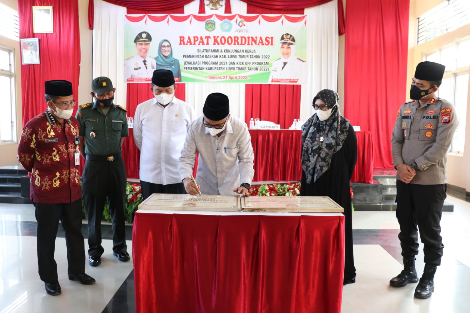 Sebelum melakukan Rakor, Bupati Luwu Timur yang didampingi unsur Forkopimda terlebih dahulu menandatangani Prasasti pembangunan USB SMPN 2 Tomoni dan pembangunan 3 Ruang Kelas Baru (RKB) SDN Kelas Jauh 172 Tomoni.
