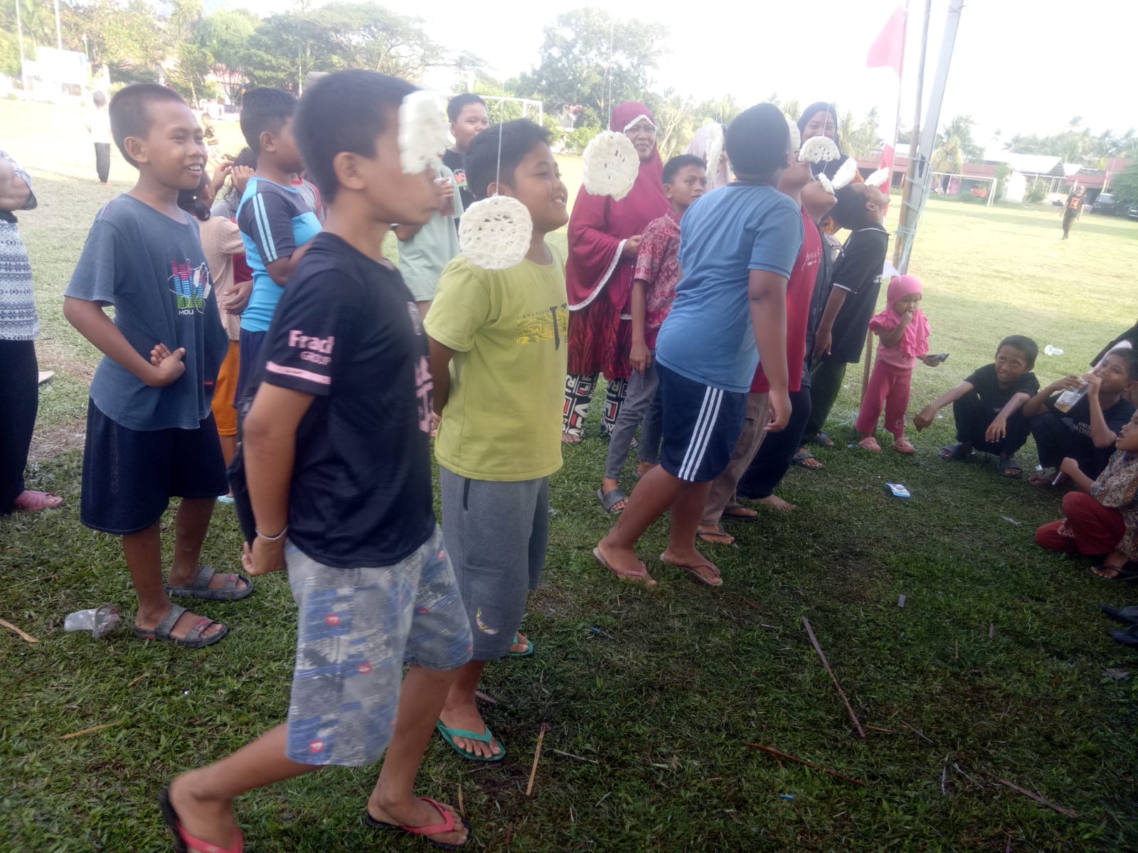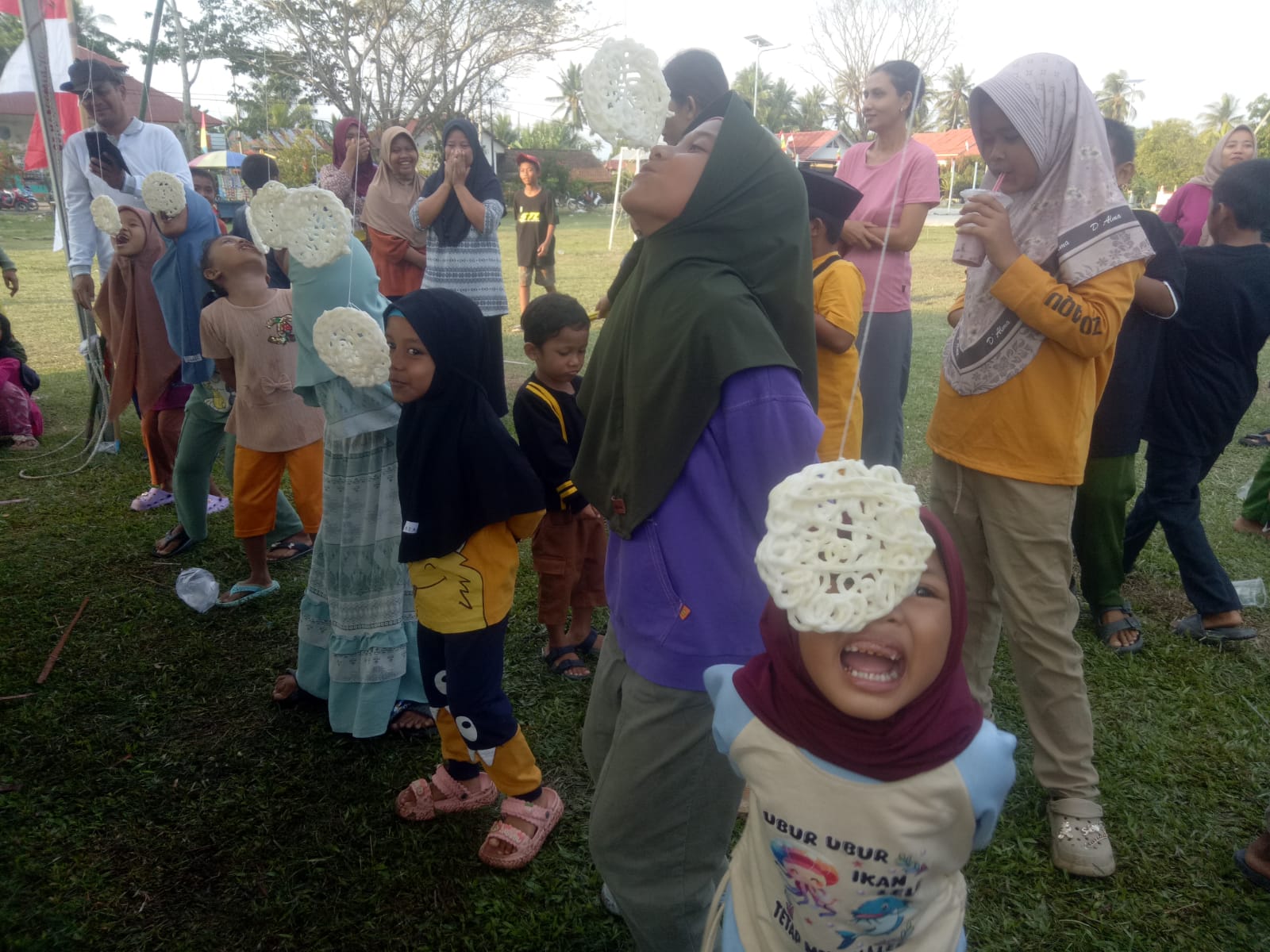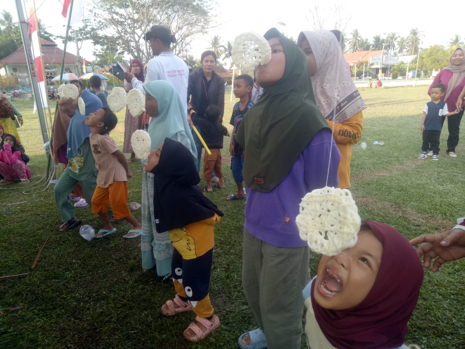 Kemeriahan makin terasa ketika peserta-peserta cilik berusaha keras menggigit kerupuk tanpa bantuan tangan. Beberapa terlihat mengangguk-angguk dan memiringkan kepala untuk menaklukkan tantangan, sementara yang lain tertawa lepas ketika kerupuknya jatuh atau berpindah arah. Momen itu menjadi hiburan tersendiri bagi warga yang hadir.