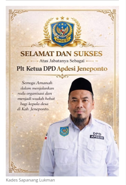 DPD Apdesi menunjuk kepala desa sapanang sebagai Ketua PLT DPC Ketua apdesi Kabupaten Jeneponto dan Kades Desa Borongtala Evendi Amba sebagai pelaksana tugas PLT sekertaris dan Desa Jombe Kecamatan turatea Junaedi sebagai pejabat pelaksana tugas PLT sebagai Bendahara.