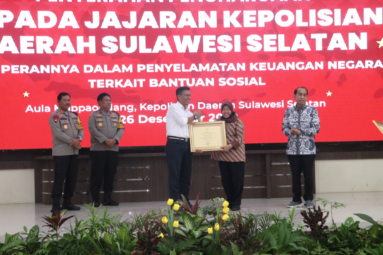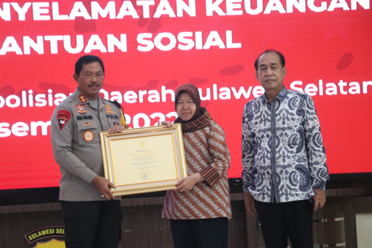 Sulsel,Chaneltimur.Com – Menteri Sosial RI Tri Rismaharini memberikan penghargaan kepada Kapolda Sulsel, Wakapolda Sulsel, Dirreskrimsus beserta jajaran khususnya Direktorat Reserse Kriminal Khusus (Ditreskrimsus) Subdit Tindak Pidana Korupsi (Tipidkor) Polda Sulawesi Selatan atas perannya dalam penyelamatan keuangan negara terkait Korupsi Penyaluran Bantuan Pangan Non Tunai (BPNT) Covid-19 Tahun Anggaran 2020.