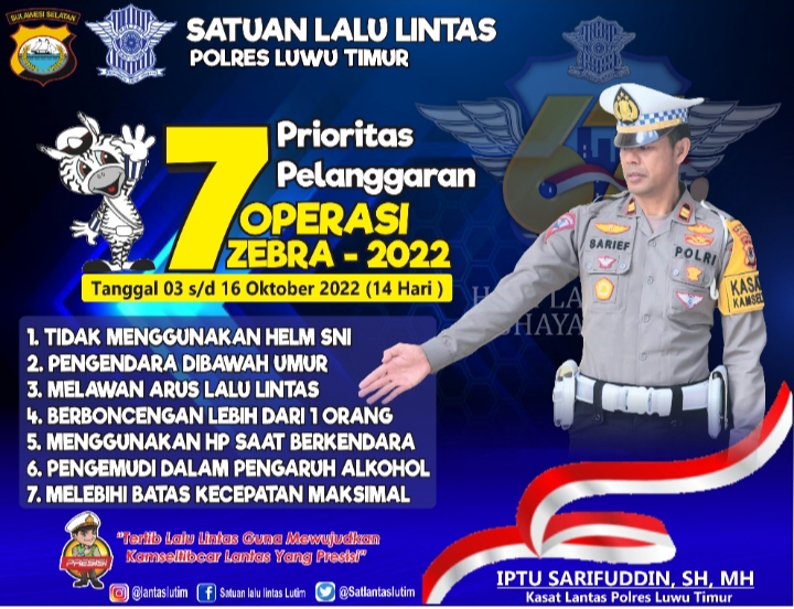 Kapolres Luwu Timur AKBP Silvester MM Simamora S.Ik MH, melalui Kasat Lantas IPTU Sariefuddin SH.MH menjelaskan, bahwa Operasi Zebra tersebut digelar untuk meningkatkan kedisiplinan masyarakat dalam berlalu lintas di jalan raya.