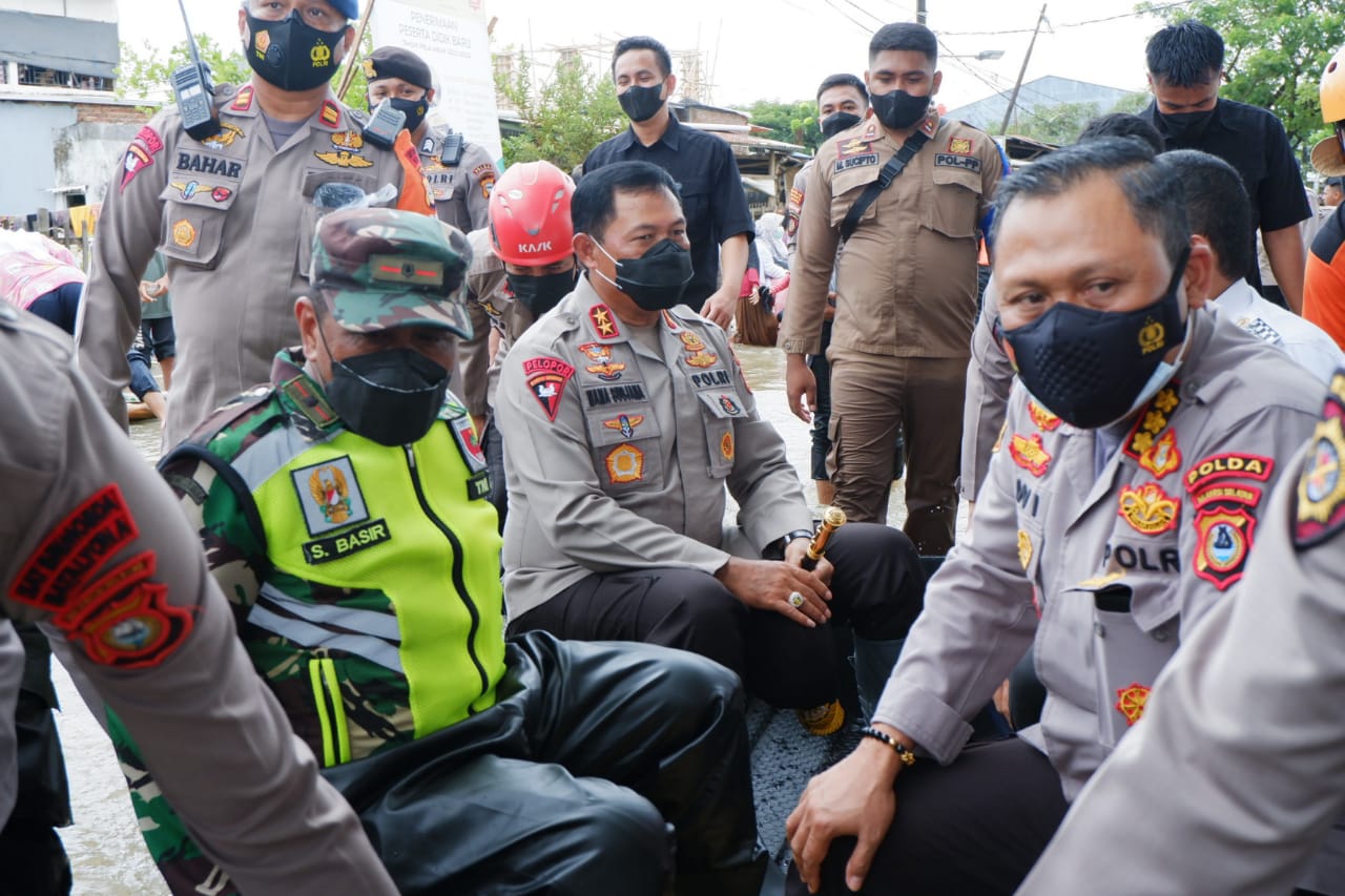 Selanjutnya, dengan menaiki perahu karet Kapolda Sulsel bersama PJU Polda Sulsel secara langsung memantau rumah rumah warga yang terdampak banjir.