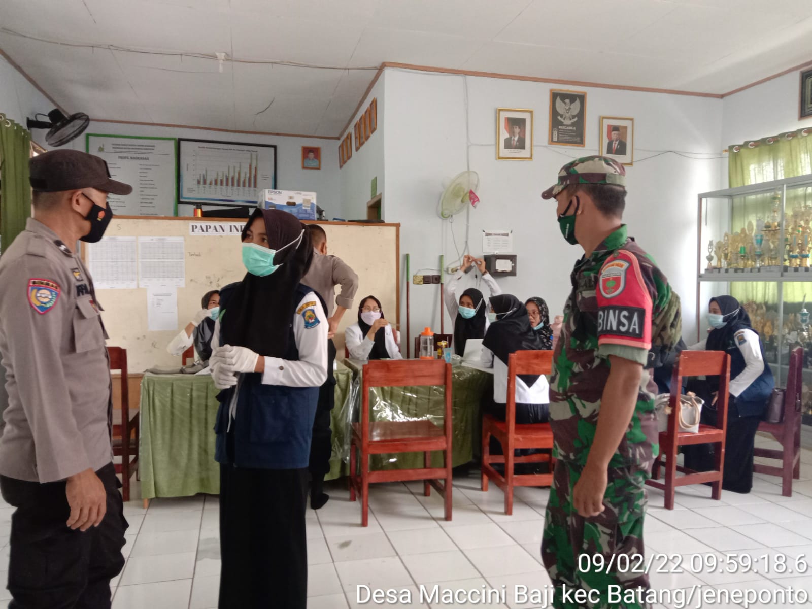 bhabinkamtibmas Aipda Muh Irfan.HM bersama Babinsa Serda Syamsuddin melaksanakan pemantauan vaksinasi bagi siswa di sebuah pesantren di wilayah binaannya yang di laksanakan oleh tim vaksinator dari puskesmas togo-togo Kec Batang Kab Jeneponto Rabu 9/2/2022.