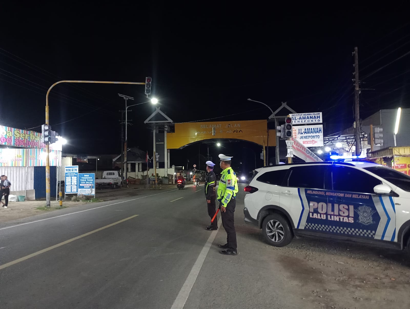 Jeneponto, Chaneltimur.com – Personel Satuan Lalu Lintas (Satlantas) Polres Jeneponto melaksanakan kegiatan patroli rutin pada Rabu malam, 15 Maret 2026. Patroli tersebut menyusuri sejumlah titik strategis, meliputi Jalan Pahlawan dan Jalan Lanto dg Pasewang, Kelurahan Empoang, Kecamatan Binamu.