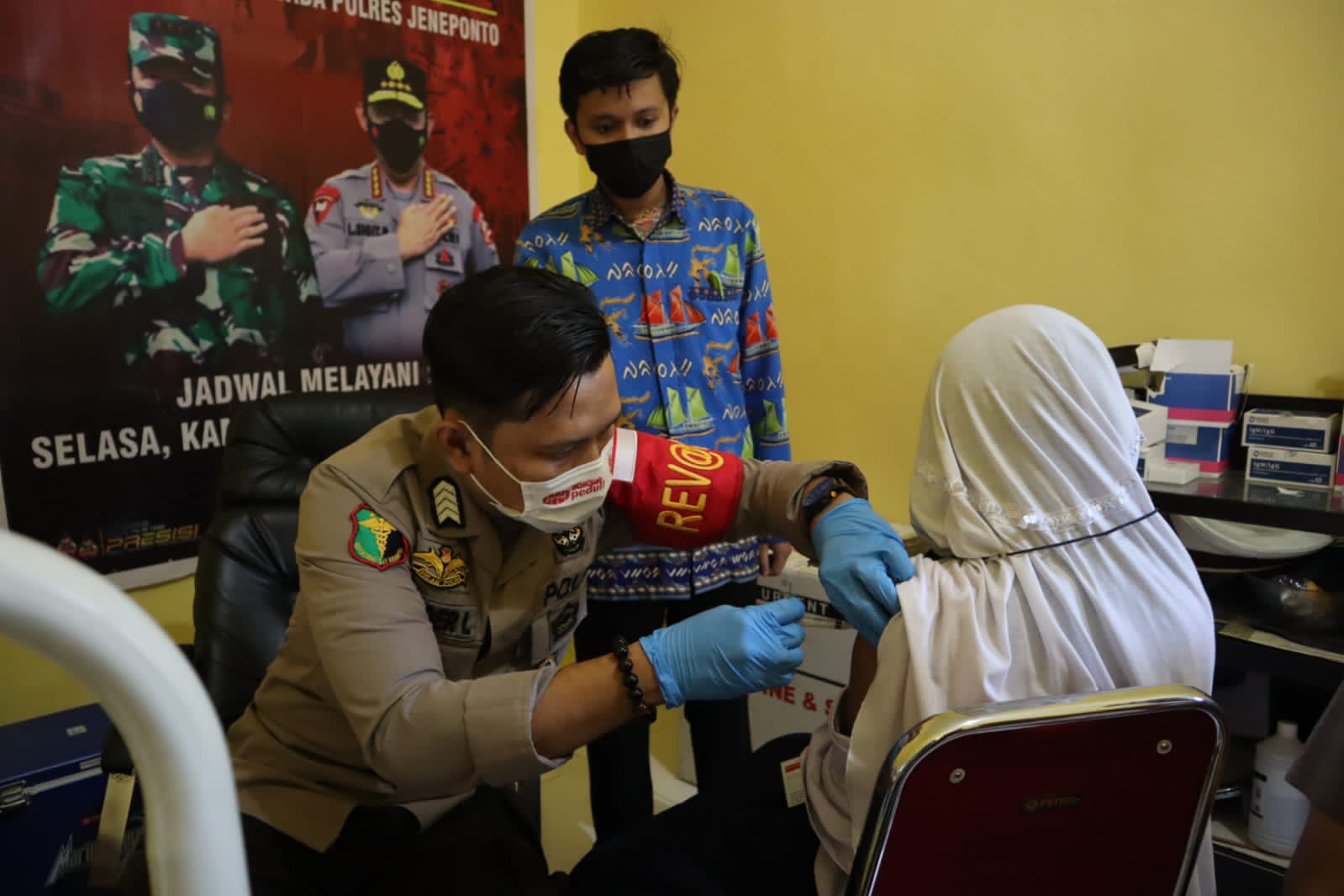 Dalam kegiatan di gedung urkes sidokkes polres jeneponto ini yang menjadi vaksinator adalah bripka Ramlan personil urkes sidokkes polres jeneponto.