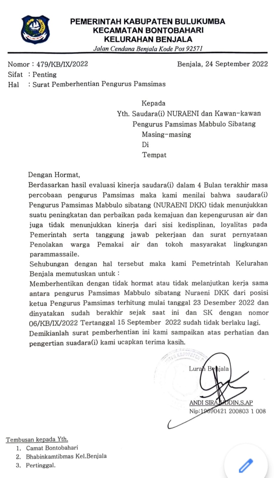 Diketahui bahwa surat pemberhentian pengurus Pamsimas Mabbulo Sibatang bertanggal 24 September 2022 namun dikirimkan dan baru diterima oleh pengurus pada hari Kamis 29 Desember 2022.