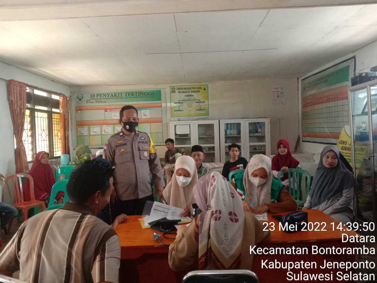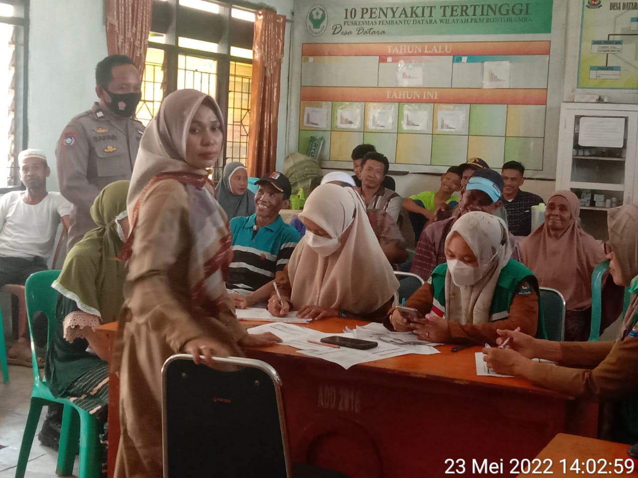 Jeneponto Chaneltimur.Com – Bertempat di kantor desa datara kecamatan bontoramba kabupaten jeneponto, bhabinkamtibmas Aiptu Safaruddin,Y memantau kegiatan pemberian aksinasi covid-19 bagi warga masyarakat oleh tim vaksinator dari nakes puskesmas bontoramba. Senin,23/5/2022.